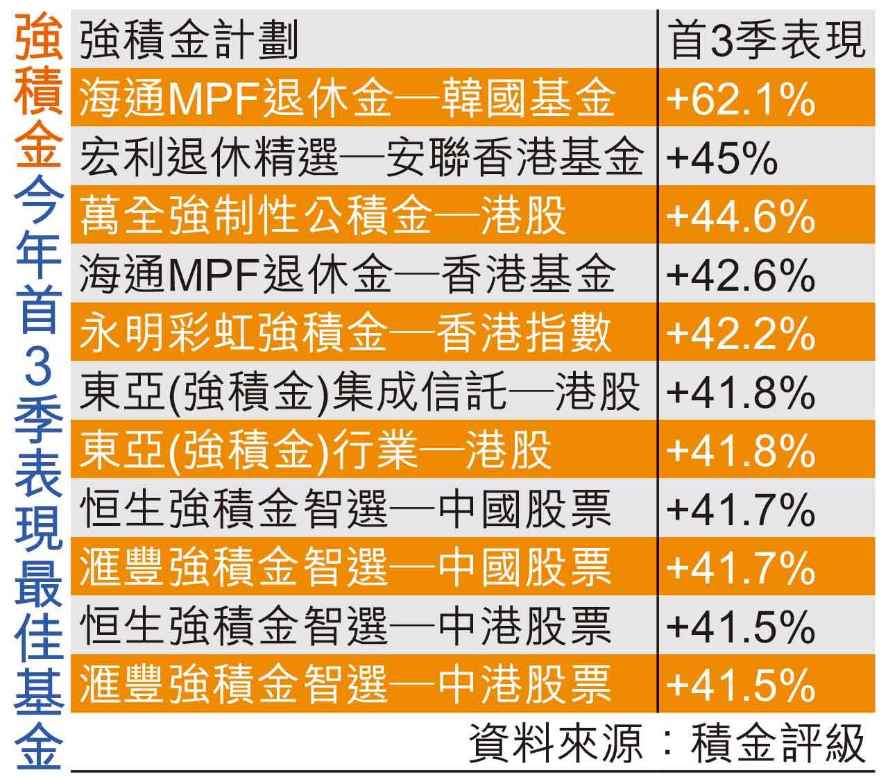 強積金今年首3季表現最佳基金 (資料來源:積金評級)