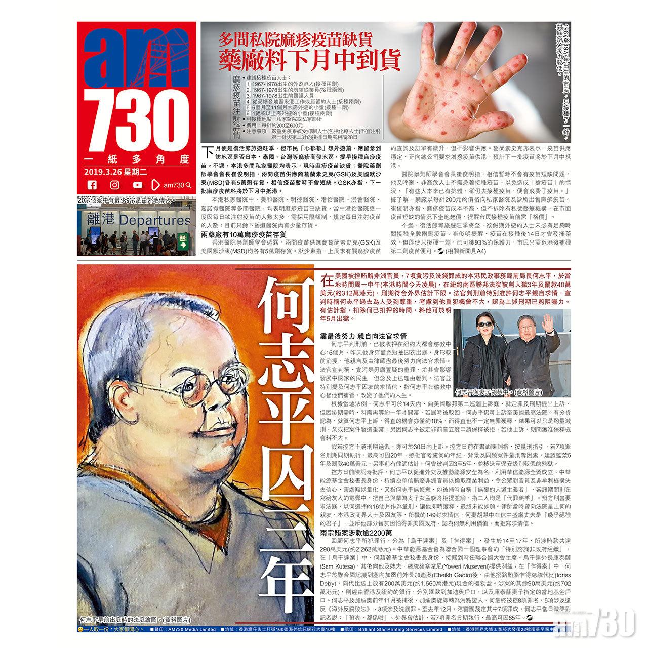 在美國被控賄賂非洲官員、7項貪污及洗錢罪成的本港民政事務局前局長何志平,於當地時間周一中午(本港時間今天凌晨),在紐約南區聯邦法院被判入獄3年及罰款40萬美元(約312萬港元),刑期符合外界估計下限。法官判刑前特別准許何志平親自求情,宣判時稱何志平過去為人受到尊重、考慮到他重犯機會不大,認為上述刑期已夠阻嚇力。有估計指,扣除何已扣押的時間,料他可於明年5月出獄。
