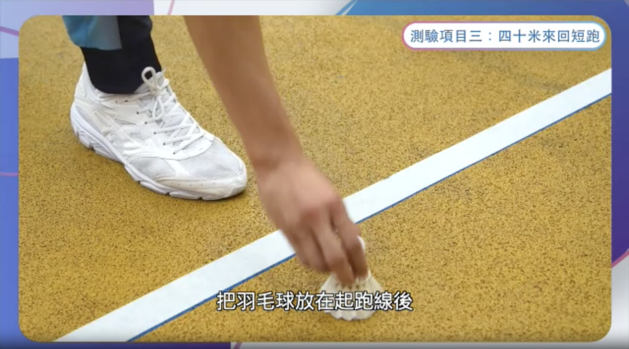 測試開始前,考生需站在起跑線後,聽到起跑指令時,考生要跑向對面的終點線,把終點線上的羽毛球拾起,再轉身跑回起跑線後放下羽毛球,然後再跑向終點線拾起剩下的羽毛球,最後跑回起跑線衝線。考生最慢要在12.3秒內完成,方計算為一分,成績以完成時間計算,跑得越快越高分。
