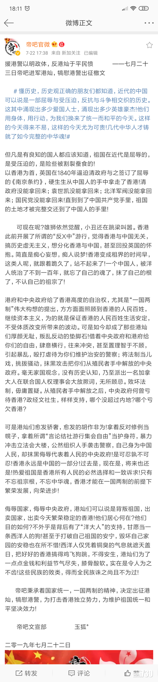帝吧今日又表示,已有1.2萬人響應號召,還發表題為《援港警以明政體,反港燦於平民憤》的「出征檄文」,批評「港燦」連日「拿著反對修例當幌子,拿著所謂『言論結社遊行集會自由』當護身符,暴力衝擊立法會大樓,公然組織人手襲擊警察,自己身為中國人民,卻抹黑侮辱代表著人民的中央政府」,而且港燦們「覺得香港與中國無關,搞歷史虛無主義,想分化香港與中國,甚至回投英國的懷抱」。帝吧強調,「是可忍孰不可忍……帝吧秉承著國家統一,一國兩制的精神,決定出征港燦,犒慰港警,為打擊香港獨立勢力,為維護祖國統一和平堅決效力」。