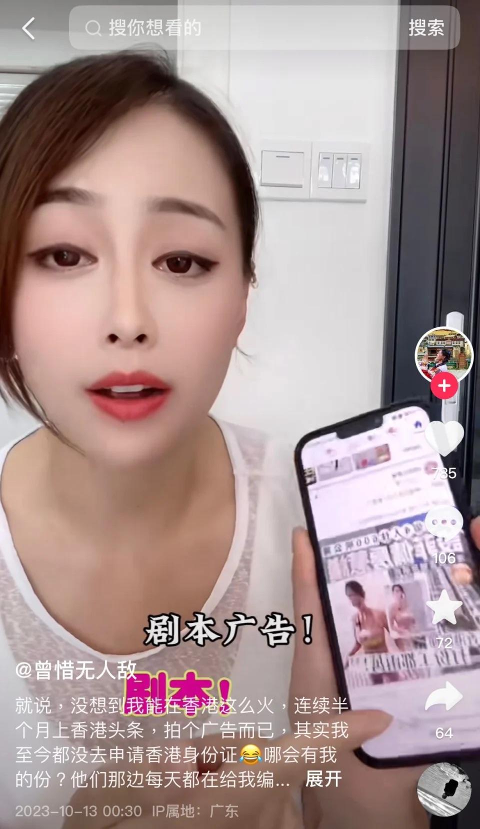 不過相隔一個月後,呢位內地辣媽就拍片公開真相,指自己係跟劇本演出:「誰懂啊?我在內地拍了幾年廣告不溫不火(不慍不火)」,我去香港拍一個爛大街這種劇本廣告,火了,而且還是爆火!劇本你們懂不懂得呀。」並話:「如果我在香港開社交帳號的話,肯定能吸一波粉」。