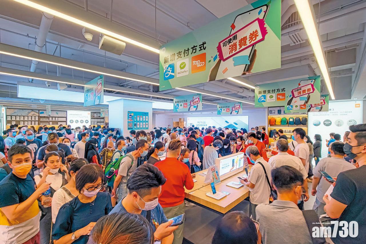 旺角一間接受電子消費券的電話專門店,昨下午逼到水洩不通。(莊振邦攝)