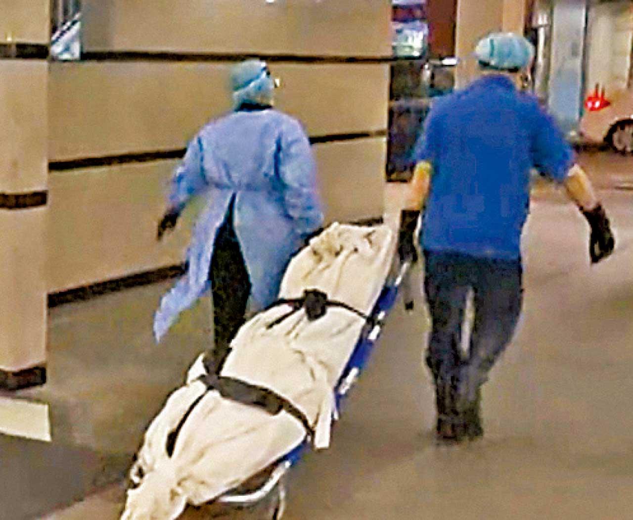 仵工將遺體運走。