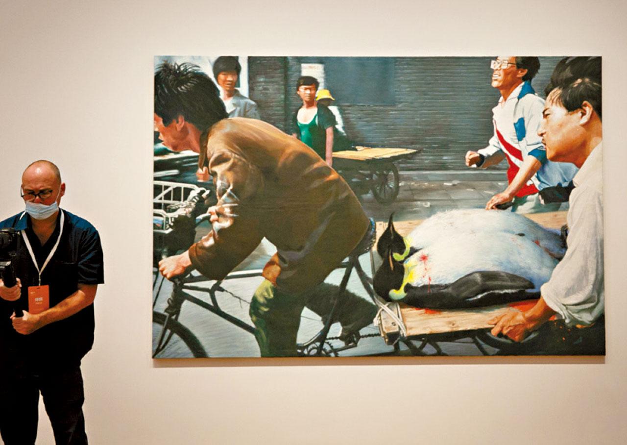西九文化區M+博物館重新對外開放,多件備受關注、含政治隱喻的展品被發現已下架。包括內地藝術家王興偉參考劉香成於1989年六四事件拍下的相片,將相中受傷人物改成企鵝的畫作《新北京》(圖);王廣義的《毛澤東:紅色方格二號》和周鐵海《新聞發佈會III》亦已撤換。藝術家艾未未的作品《洗白》和《長安街》則繼續展出。