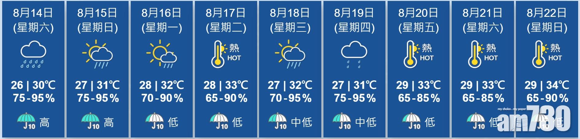 此外,雷暴警告現正生效,天文台預計本港地區今日天氣大致多雲,有驟雨及雷暴,局部地區雨勢頗大,吹和緩南至西南風,離岸風勢清勁,氣溫介乎26度至30度,展望明日間中有驟雨,下午短暫時間有陽光,隨後一兩日天色好轉。