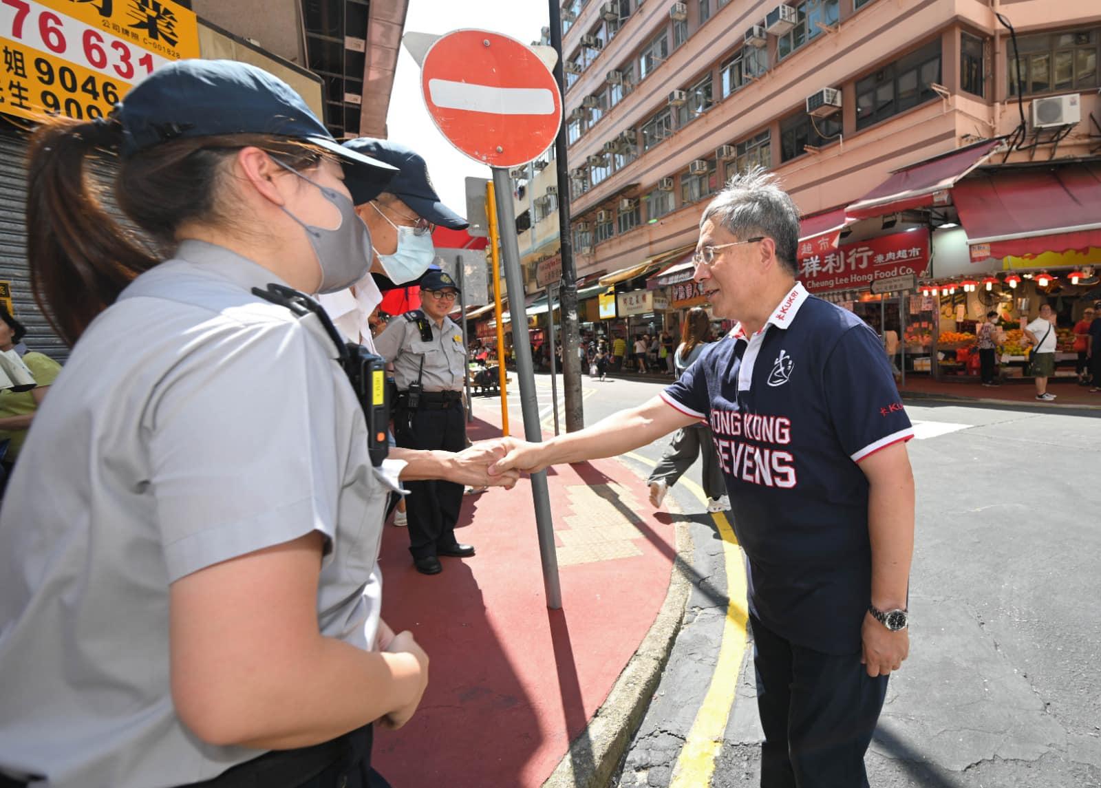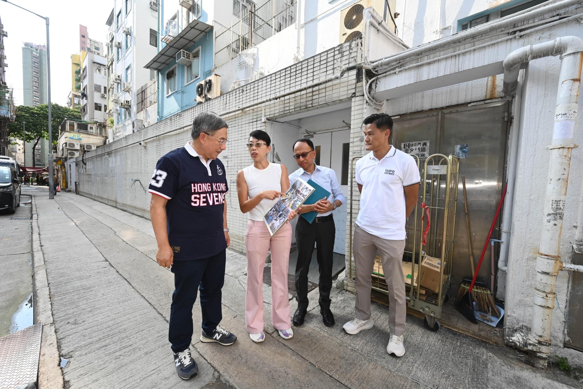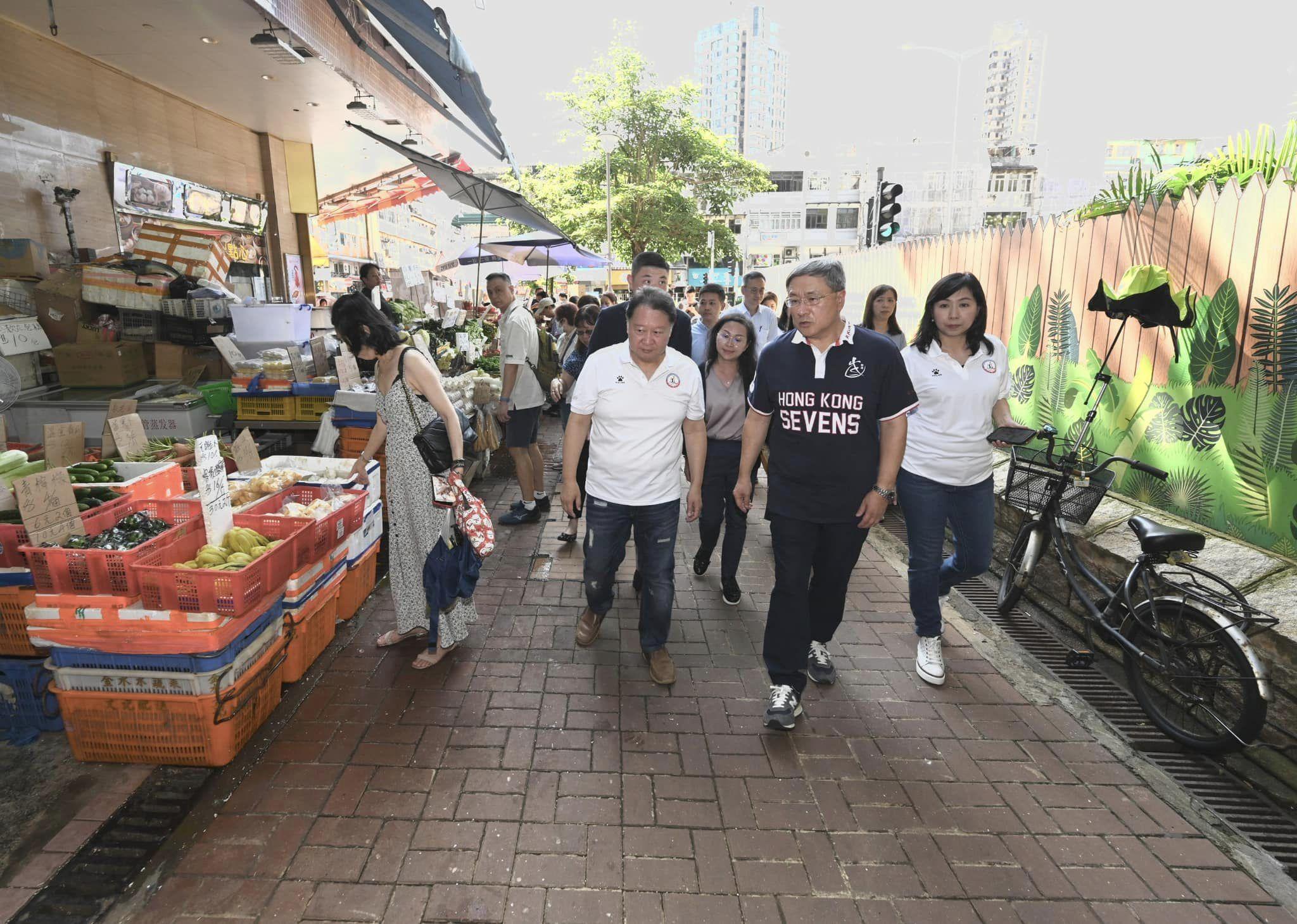 其後,卓永興聯同北區民政事務專員賴子堅視察上水龍豐花園。以往該處的店舖阻街和霸路情況十分猖獗,但在2022年底經整頓後已有一番新氣象。鳳水分區委員會委員王潤強說,以前行人路堆滿膠箱和發泡膠,輪椅人士無法通過,但過去年半的情況已經完全扭轉,連帶龍豐花園低座的鼠患情況都大大改善。