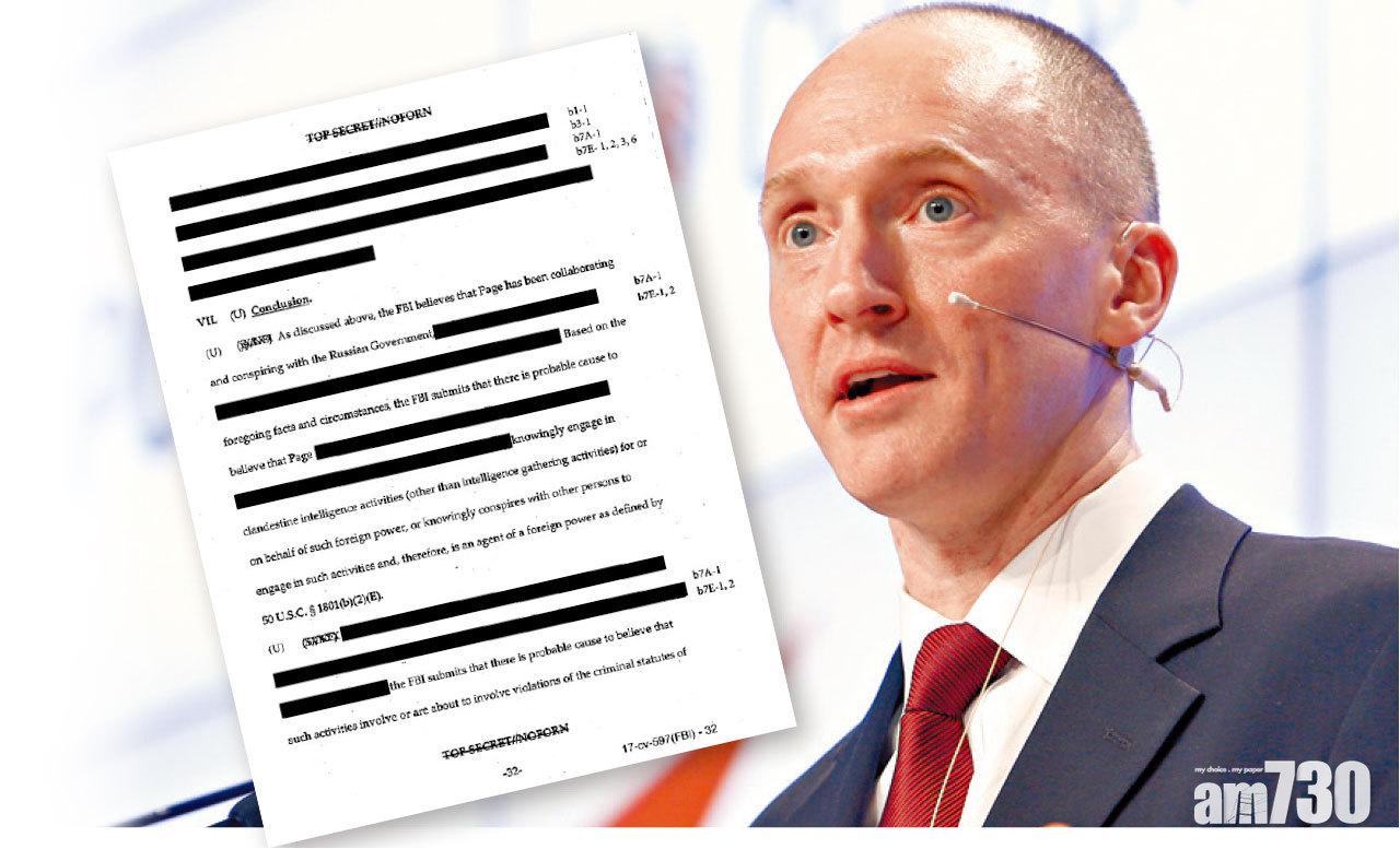 美國總統特朗普競選團隊的通俄案未有調查結論之際,聯邦調查局(FBI)公開412頁文件,涉及調查競選團隊顧問佩奇(Carter Page)是否串謀俄羅斯政府,影響2016年美國大選,當中包括向外國情報監控法院申請監聽佩奇及其他搜查令。在2016年10月的申請中,FBI認為佩奇一直串通俄羅斯政府,至翌年特朗普就任總統後,FBI仍申請延長對佩奇的監控。特朗普昨批評,該批文件反映其競選團隊被非法監控,以助其競選對手希拉莉。