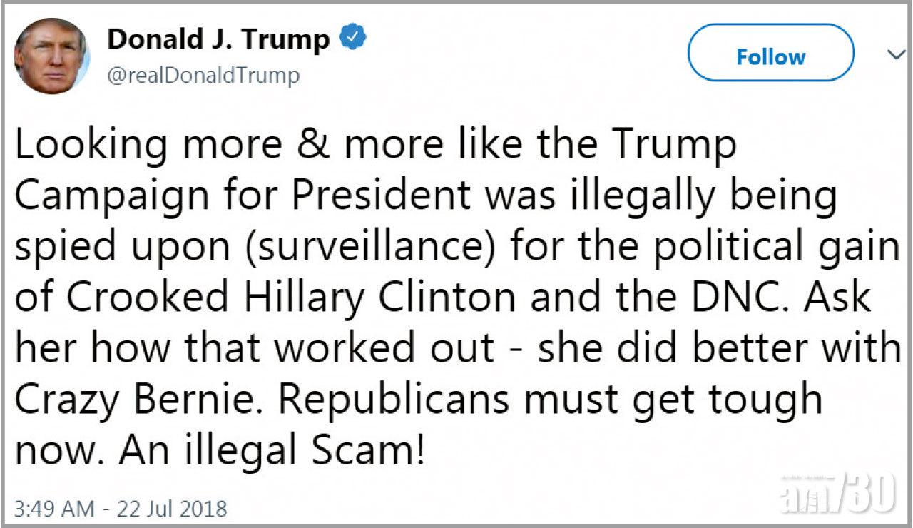 特朗普昨在Twitter稱,FBI新公開的文件顯示,其競選團隊遭非法監控,以助希拉莉和民主黨獲政治得益。(互聯網)