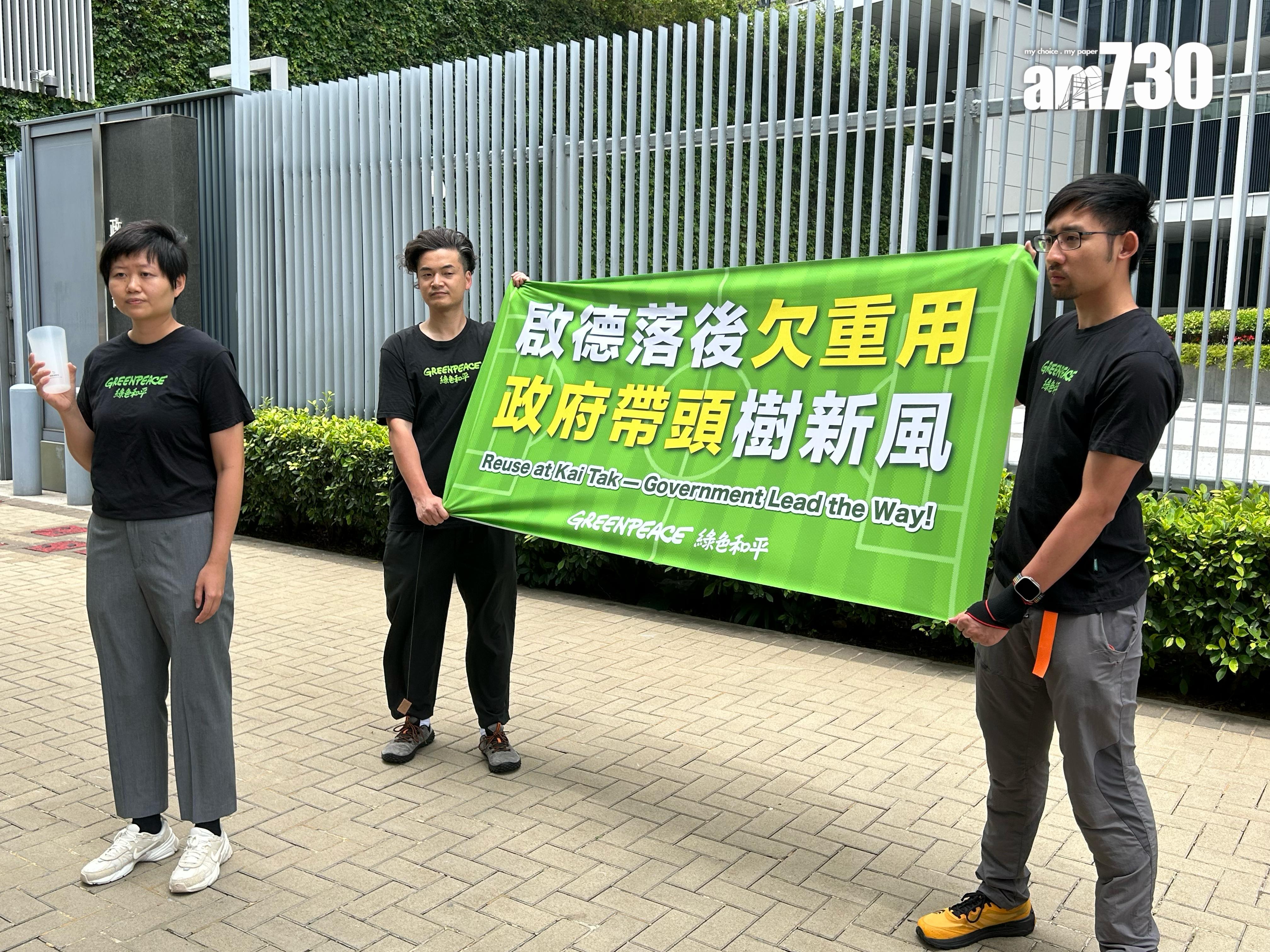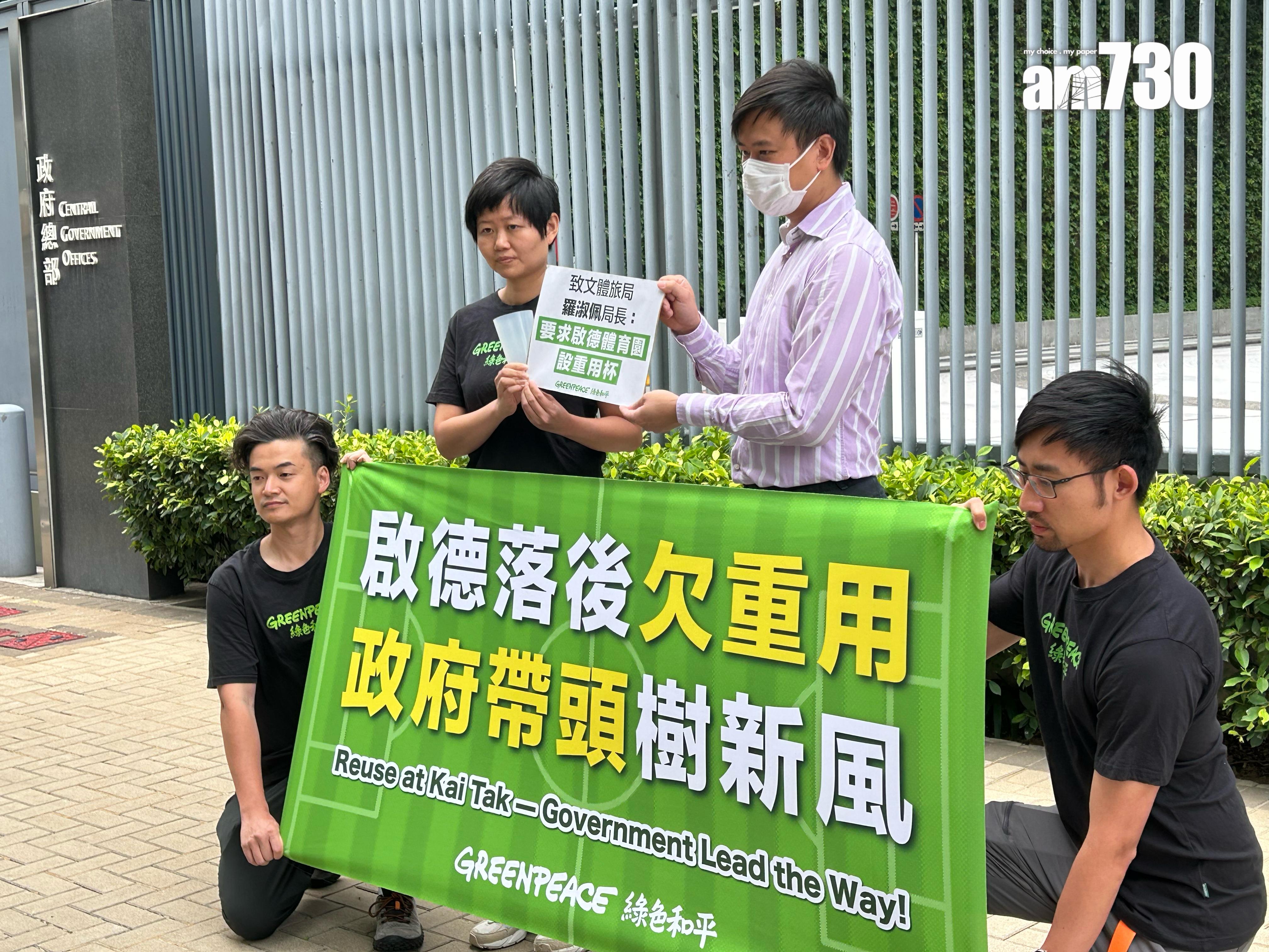 綠色和平今早在政府總部外請願,並向文化體育及旅遊局局長羅淑佩發公開信。信中指曾兩度去信啟德體育園,提倡設立重用杯系統,但對方答非所問,其後更加不再回覆。綠色和平推算體育園每年會產生數百萬件即棄餐具,11月舉行的全國運動會部分項目會在體育園舉行,而在7月則有英超三支勁旅在體育園舉行表演賽。綠色和平指出3支英超勁旅利物浦、阿仙奴和熱刺均著重環保概念,其主場都有提供重用杯服務。綠色和平減廢項目主任譚穎琳直指體育園的硬件可說是「世一」,希望環保方面亦可以是「世一」。她促請政府趁這兩個盛事,協助體育園建立重用杯先導計劃,未來再變成恆常措施,讓園方在環保上「追落後」,舉辦「綠色盛事」可成為宣傳香港的良機,「說好香港綠色故事」。