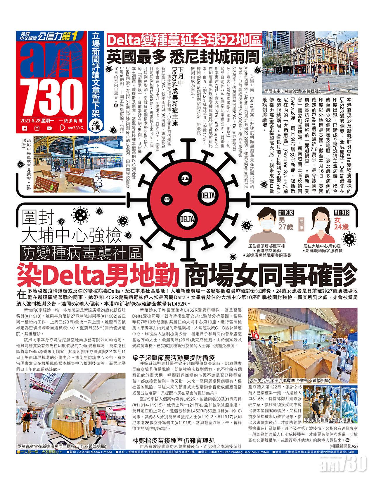 在多地引發疫情爆發或反彈的變種病毒Delta,恐在本港社區蔓延!大埔新達廣場一名顧客服務員昨確診新冠肺炎,24歲女患者是日前確診27歲男機場地勤在新達廣場兼職的同事,她帶有L452R變異病毒株但未知是否屬Delta。女患者所住的大埔中心第10座昨晚被圍封強檢,而其所到之處,亦會被當局納入強制檢測公告。連同5宗輸入個案,本港昨新增的6宗確診全數帶有L452R。