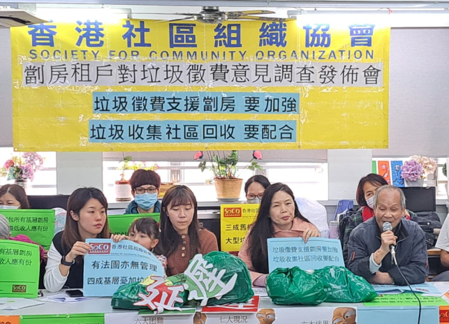 政府8月1日於實施垃圾徵費,香港社區組織協會上月訪問306名低收入劣居所租客,結果發現43.1%劏房居民贊成容許一袋多用,要求商店將散裝單個指定袋代替塑膠購物袋,37.6%希望政府可以定期幫忙到三無大廈收垃圾,尤其是大型垃圾。但為減少用垃圾袋,逾半人表示改為將多於一天的垃圾集合及棄置,兩成半會將廚餘倒入廁所馬桶,或引致衛生及渠口淤塞問題。