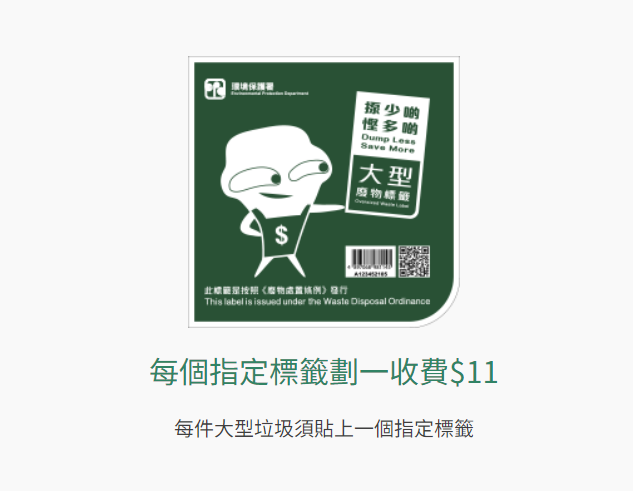 如市民需棄置一些無法放入指定袋的大型垃圾(例如餐桌、書櫃或床褥等大型傢俬),則必須貼上指定標籤;否則該等大型垃圾也會被視為違規垃圾;在公用垃圾收集點棄置未有以指定袋包妥或貼上指定標籤的任何垃圾(包括回收物),即屬違法。