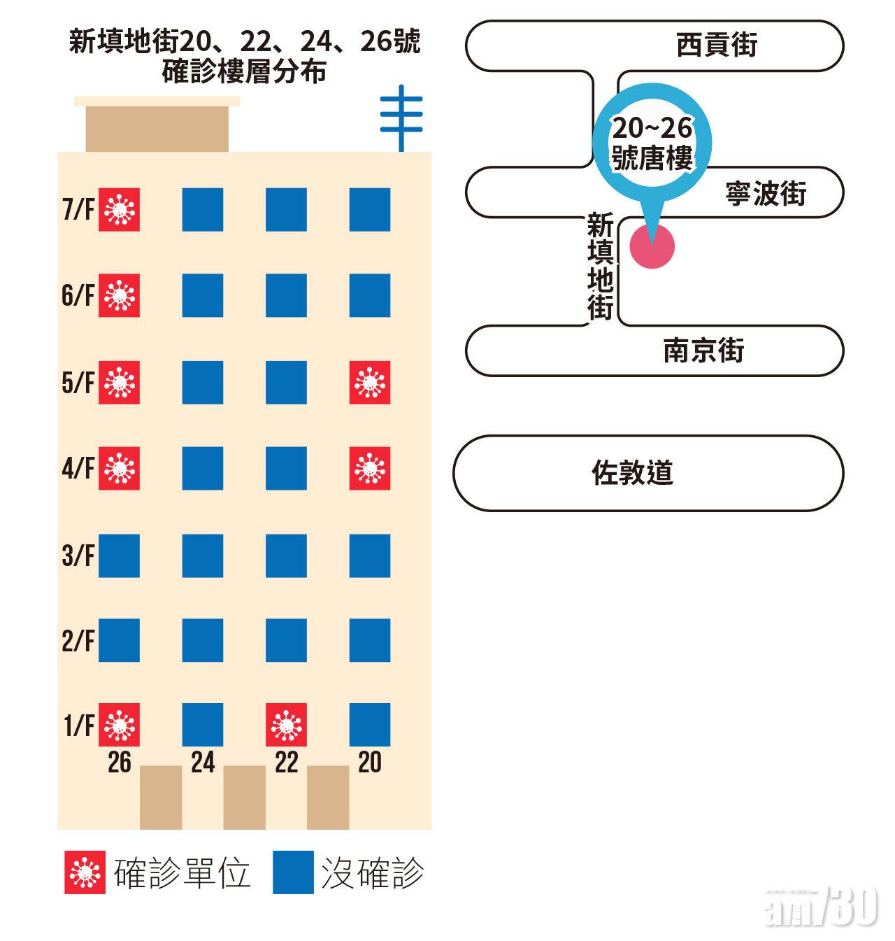 新填地街20、22、26號唐樓多人確診。