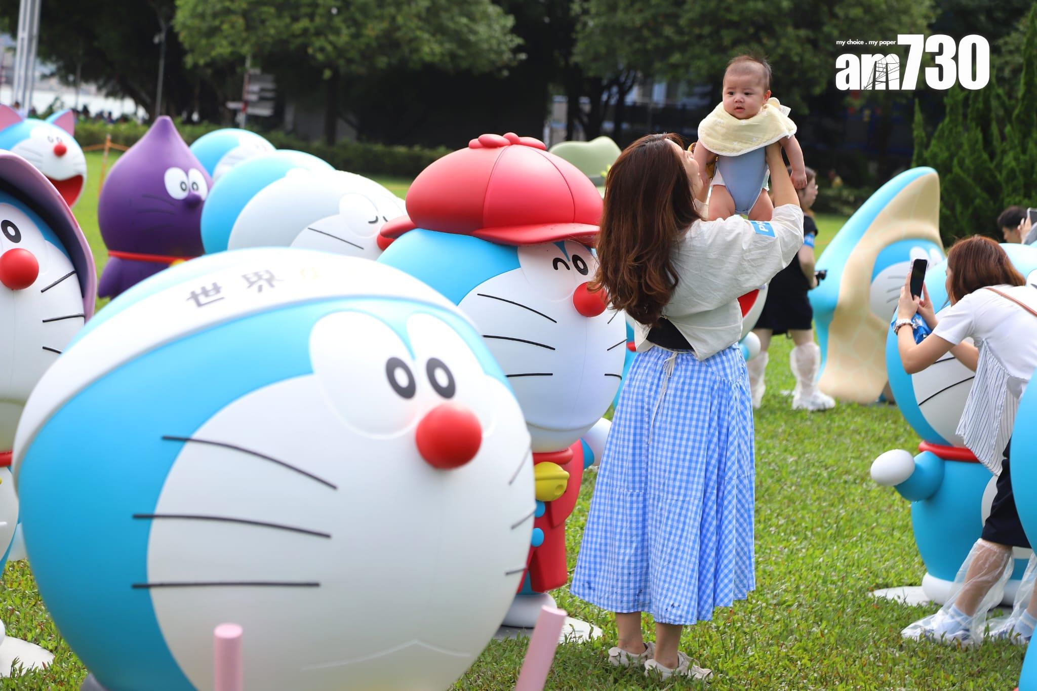多啦A夢展覽在中山公園快閃 觀眾可留意今晚多啦A夢無人機表演惡劣天氣安排(羅錦鴻攝)