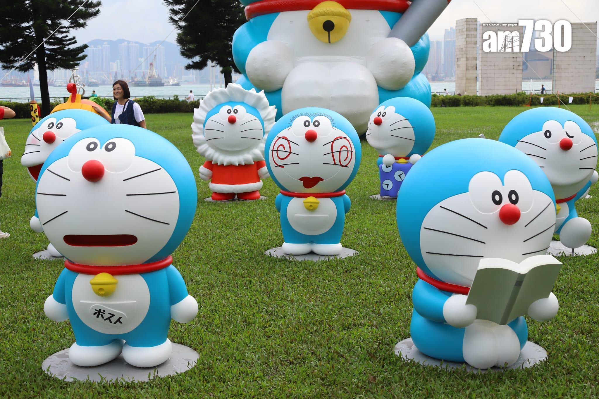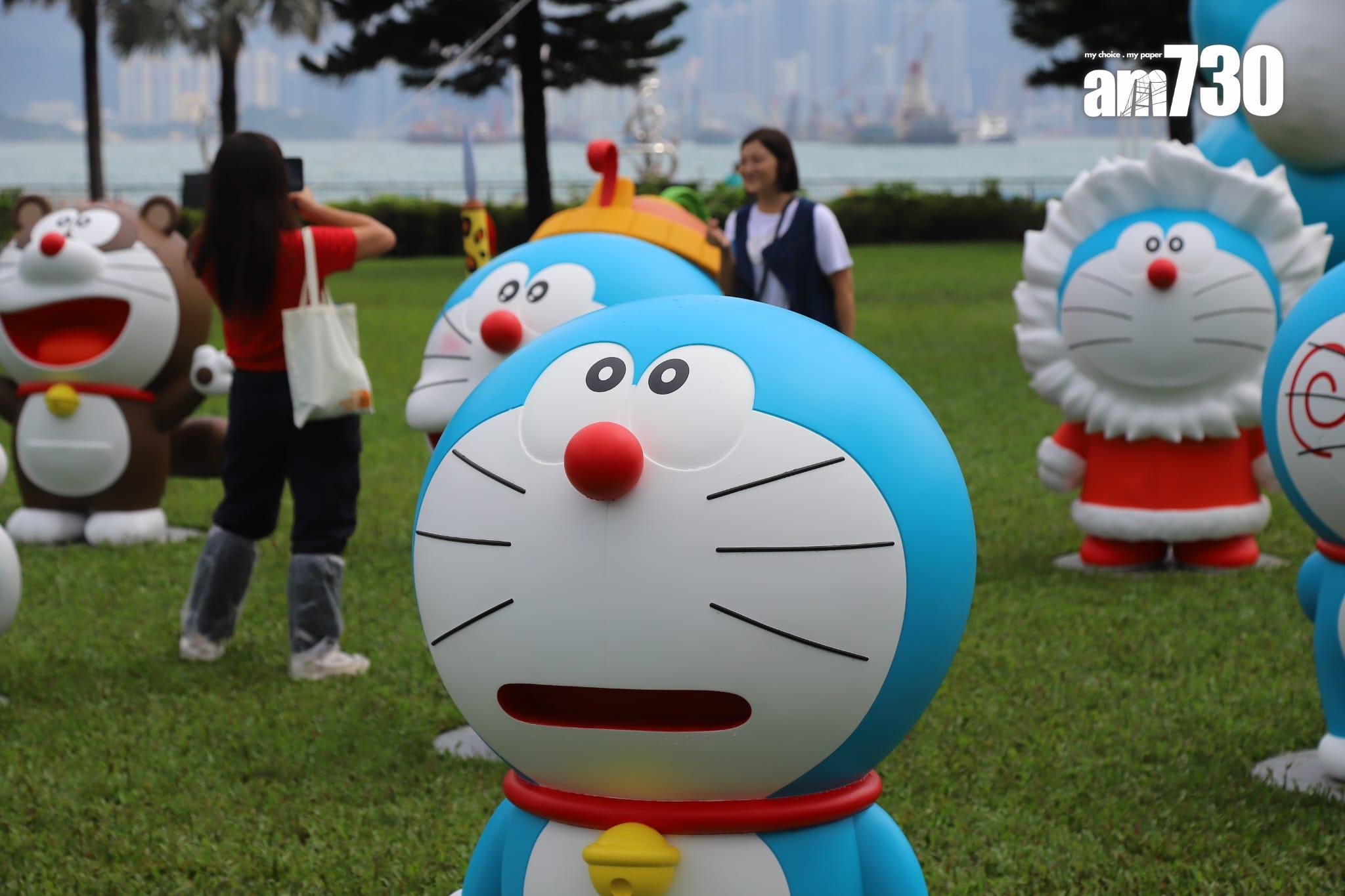 多啦A夢雕塑展覽今早在西營盤中山紀念公園「快閃」,有高12米的充氣多啦A夢,及60隻一比一大小的雕塑。