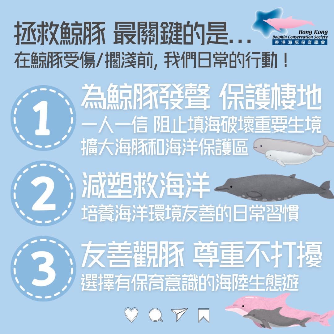 「香港海豚保育學會」向傳媒表示,一直有觀察香港境內的白海豚和江豚情況,相中所述的白海豚編號WL79,又叫「V仔」,已經觀察約10年;又指「V仔」自4月頸部纏繩,一直持續留意;目前牠活動正常,「包括食嘢、正常游水、同其他海豚朋友聯誼」,不宜捕捉或麻醉,以免造成更大傷害。她強調,小型海豚遇到此情況,沒有一種人為干預或救援是對海豚是安全的:「唔應該捉佢、麻醉佢,因為會對佢影響仲大,傷害到佢,希望大家明白。」目前牠的活動狀態不錯,亦無擱淺跡象,唯有待牠自己脫掉,或是圈住繩索來生活。市民若想幫助海豚生活得更好,唯有由其他地方着手,包括保護大嶼山水域、減少干擾、垃圾等等。可從減少海洋垃圾等方面下手,保護中華白海豚。