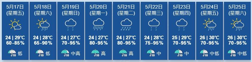 天文台展望明日短暫時間有陽光,隨後兩三日驟雨增多,雨勢有時較大。(香港天文台)
