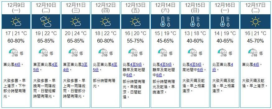 據天文台9天天氣預測顯示,周四(12日)起氣溫轉冷,周六(14日)起一連3日天氣轉凍,周六市區氣溫低見15度,下周日(15日)更低見13度,下周一(16日)回升至14度。