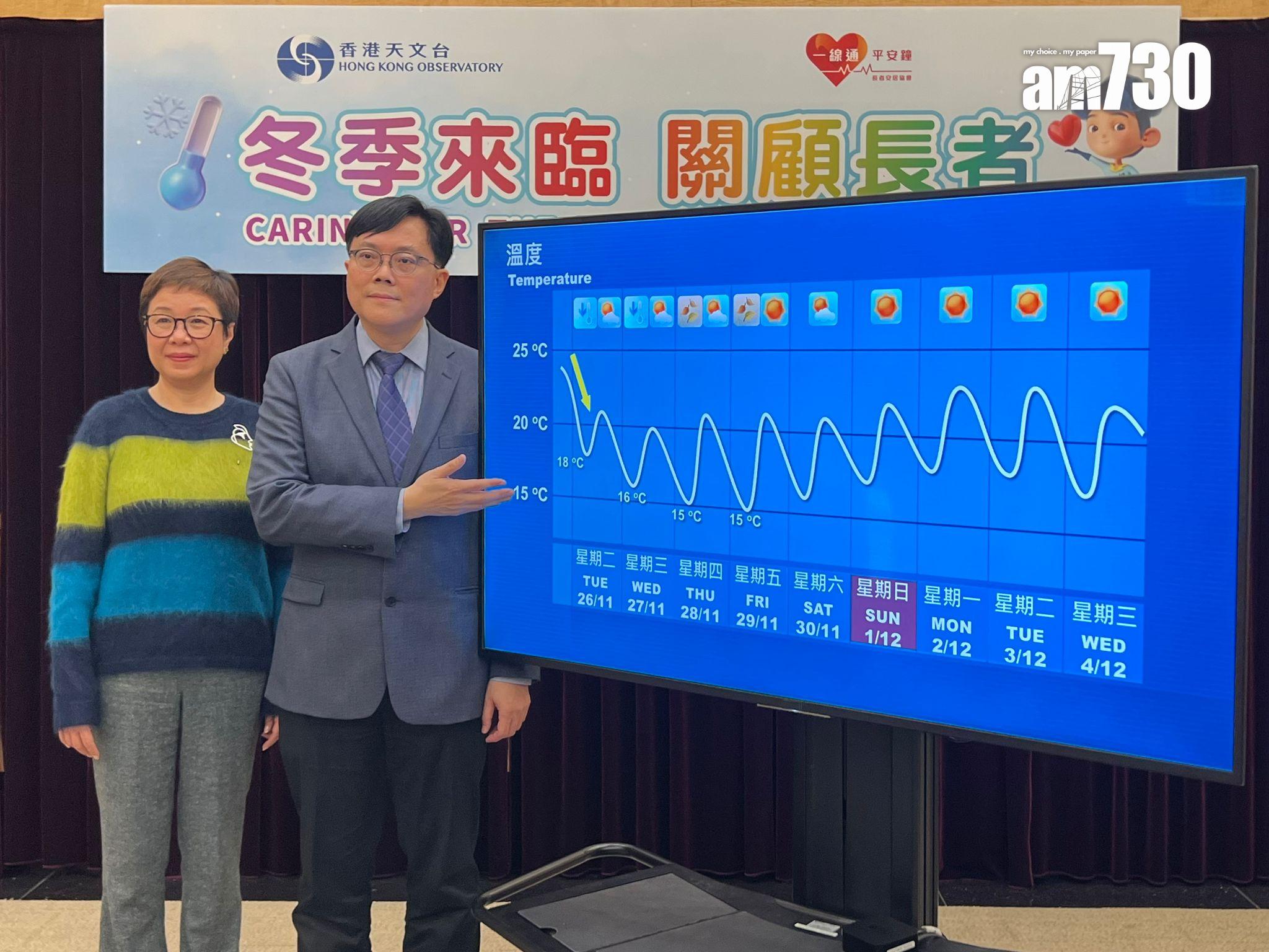 天氣轉冷,市民特別是長者需注意保暖!天文台表示,受東北季候風影響,本周氣溫低見15度。天文台和長者安居協會呼籲市民,尤其是長者留意天氣變化。