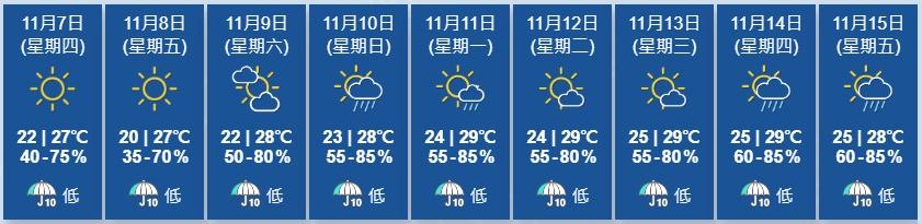 天文台展望明早仍然稍涼,最低氣溫在20度左右,日間非常乾燥。周末期間雲量增多,海有湧浪。(香港天文台)