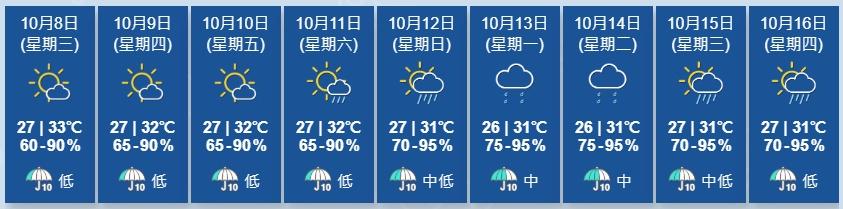 天文台展望未來一兩日大致天晴。週末期間部分時間有陽光,有一兩陣驟雨。(香港天文台)