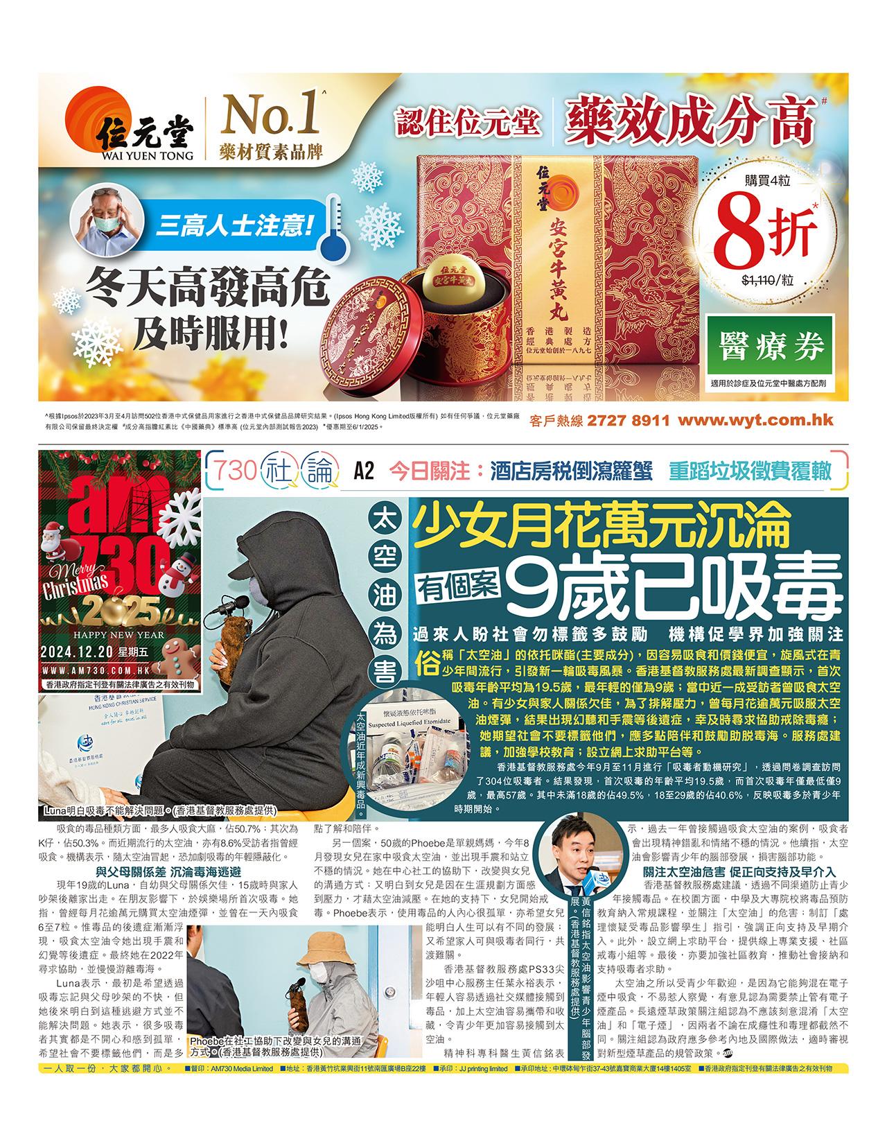 俗稱「太空油」的依托咪酯(主要成分),因容易吸食和價錢便宜,旋風式在青少年間流行,引發新一輪吸毒風暴。香港基督教服務處最新調查顯示,首次吸毒年齡平均為19.5歲,最年輕的僅為9歲;當中近一成受訪者曾吸食太空油。有少女與家人關係欠佳,為了排解壓力,曾每月花逾萬元吸服太空油煙彈,結果出現幻聽和手震等後遺症,幸及時尋求協助戒除毒癮;她期望社會不要標籤他們,應多點陪伴和鼓勵助脫毒海。服務處建議,加強學校教育;設立網上求助平台等。