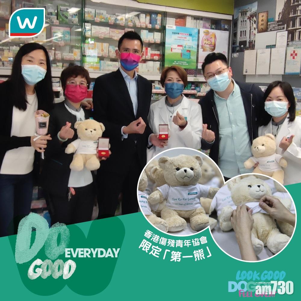 屈臣氏多來年都會為長期服務的同事頒發心意禮物,以表敬意,今年向近160名符合條件員工頒獎,崗位包括店舖、貨倉及辦公室同事,當中10位分別服務滿30及35年的同事。屈臣氏今年額外送出的「第一熊」,是香港傷殘青年協會轄下的畢業熊公仔禮品服務,製作團隊涵蓋不同專業的殘疾人士,屈臣氏邀請到協會為今年長期服務獎作特別設計,在每隻熊仔的白色上衣上,印有各得獎同事的姓名及服務年資,具意義及紀念價值。