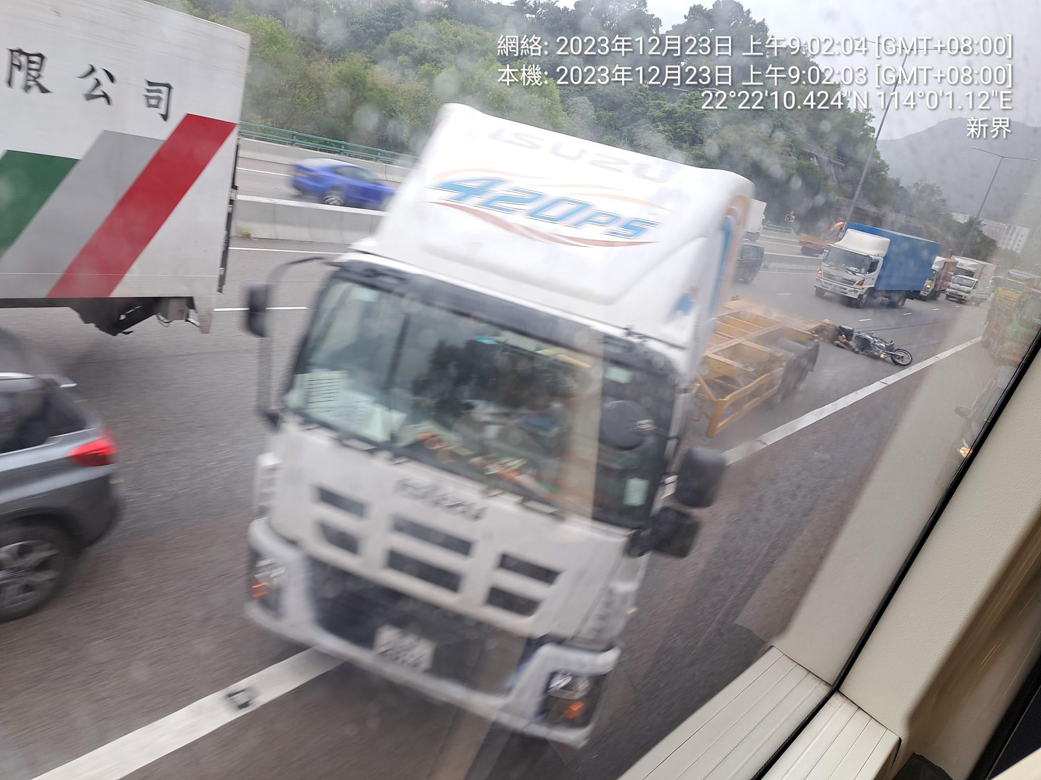 今日(23日)早上9時04分,屯門公路近小秀村、往九龍方向,一輛拖頭與一輛電單車相撞,鐵騎士一度被困拖頭車底,其後自行爬出。