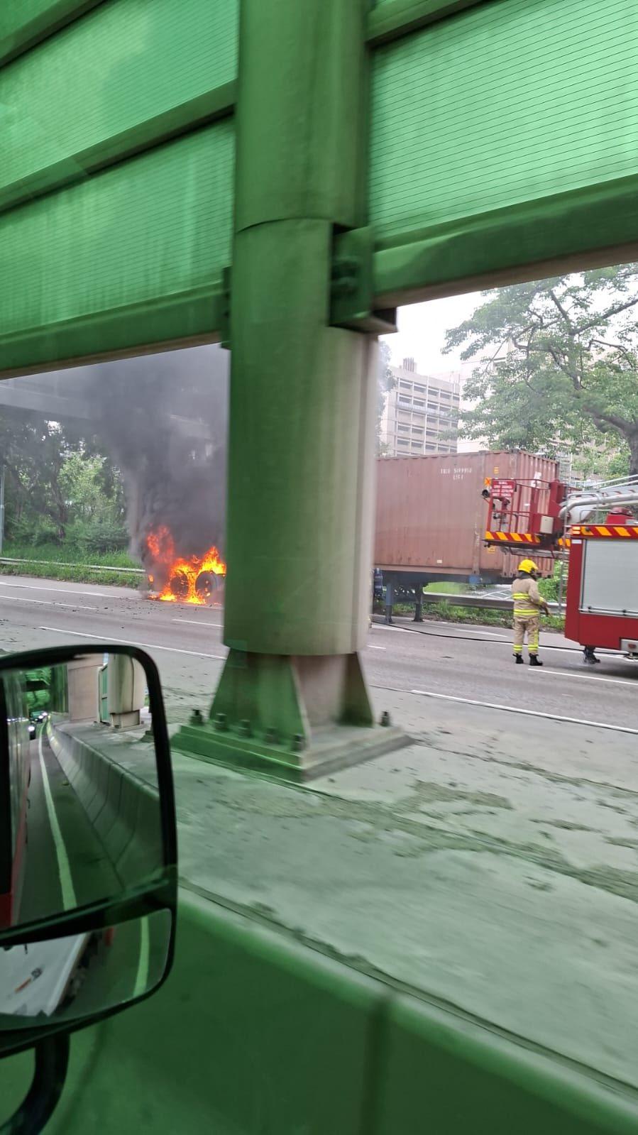 屯門公路貨櫃車車尾起火,濃煙捲半空交通受阻。(馬路的事討論區Facebook)