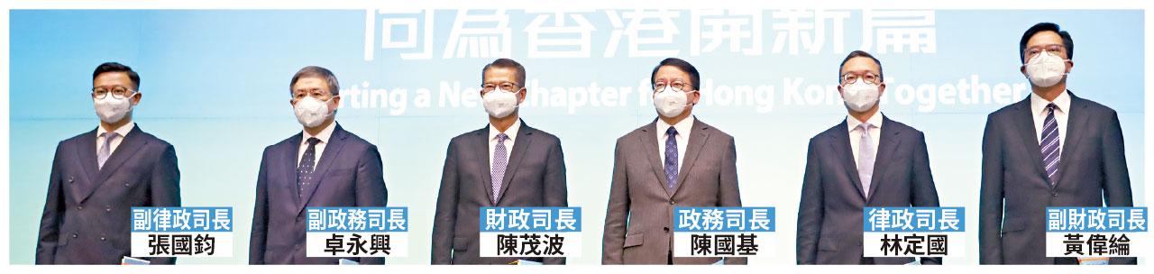 新一任政務司長,由原來的特首辦主任陳國基出任;副司長是修例風波期間,對話辦公室主任、退休政務官卓永興。3名司長中只有財政司長陳茂波留任,發展局長黃偉綸升任財政司副司長。至於律政司正、副司長都是新面孔,分別是大律師公會前主席林定國,和本身是律師的民建聯副主席兼立法會議員張國鈞。李家超亦委任保安局常任秘書長葉文娟當特首辦主任,形容她敢於進言,可跟自己優勢互補。