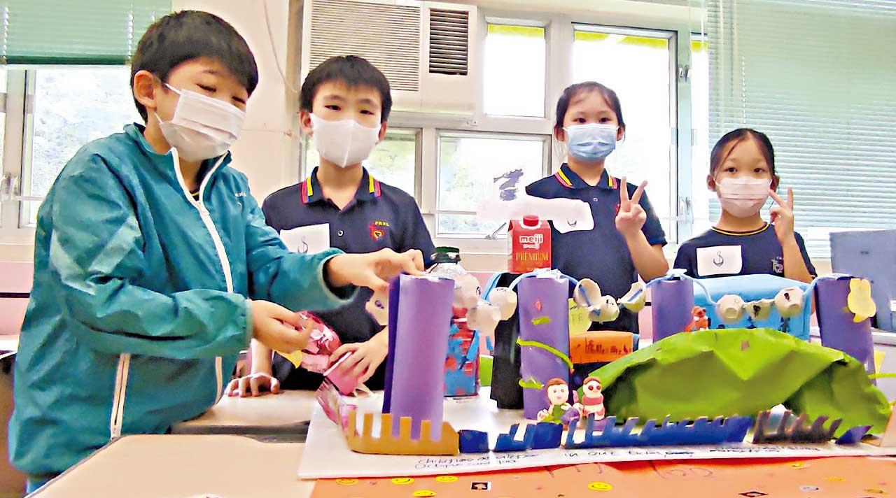 學生學習香港18區時更會分組用回收物料製作18區模型。(李朗僑攝)