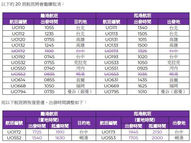 由香港往台中的UO172及由台中回港的UO173、以及由香港往峴港的UO552和由峴港返港的UO553航班,將會恢復營運,但出發時間由原定早上至下午初段,改為下午至晚上服務。至於仍取消的20航班,包括台灣、越南、南韓首爾和日本福岡、泰國曼谷等,HK Express呼籲航班已被取消的乘客無需急於前往機場,並定期留意電郵查看航班最新消息,按指示免費更改行程或安排退款。如航班未受影響,在航班出發前至少3小時抵達機場,以便有足夠時間辦理登機手續,而身處機場的旅客亦可留意機場內的航班資訊顯示屏提供的最新狀況。HK Express提醒其他不受影響航班的旅客,可如常出發至機場。