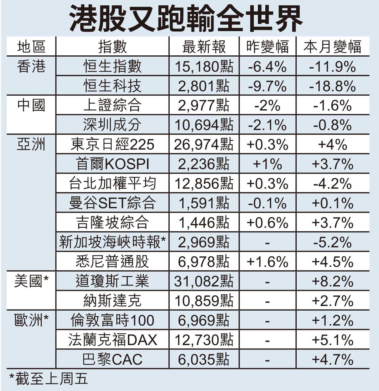 科技股淪提款機,恒生科技指數表現明顯跑輸,昨報2,801點,失299點或9.7%,失三千大關,跌勢為港股3大指數中最慘情,並再創指數推出以來最低位。大跌市下成交亦急升,主板錄1,618億元成交額,為近4個月來最高,大市沽空率17.5%。連日跌市後,港股昨市值約27.24萬億元,單日蒸發1.8萬億元,累計本月失近3.6萬億元,今年共失15.1萬億元;恒指則本月累挫11.9%,今年則瀉35.1%。事實上,恒指近月表現大幅跑輸環球股市,亞洲及歐美主要指數本月普遍錄升幅,日股本月漲約4%,美股道指亦彈約8%。昨多達10隻藍籌股價單日跌最少一成,包括「ATMJ」,美團(3690)下挫14.8%;騰訊控股(700)大跌11.4%,逾5年低並下試200元大關;阿里巴巴瀉11.4%;京東失13.2%,與阿里齊創上市後低。倘連同亦為外資重倉股、昨大跌9.5%的友邦保險(1299),5股合共拖低恒指602點,佔近六成跌幅,並躋身五大活躍港股,合共成交額477億元,佔主板成交額近三成。