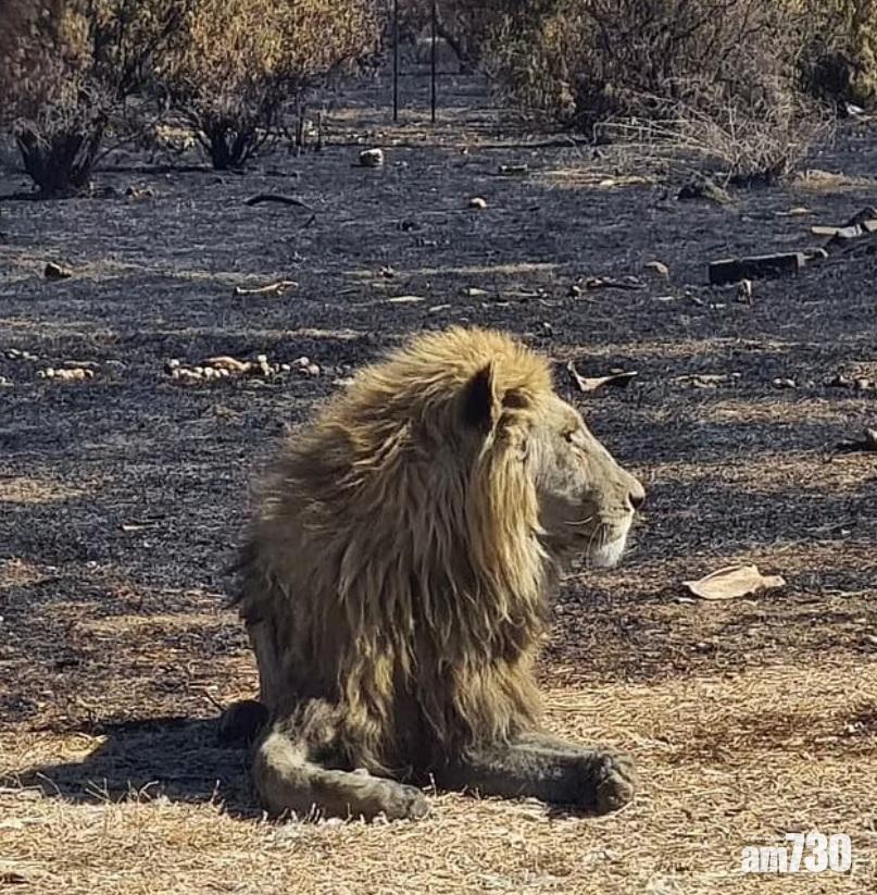 獅子虛弱,無法站起,爪子燒傷,皮毛熏黑。(互聯網)