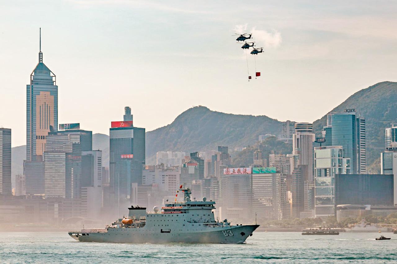 戚繼光艦昨早進入維多利亞港範圍,飛行服務隊直升機掛著國旗及區旗在上空盤旋。