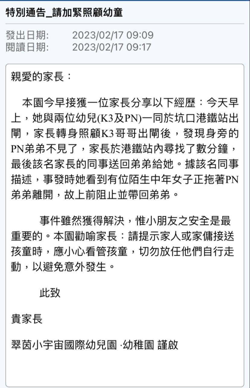 據區內一間幼稚園的通告表示,早上接獲家長分享,指與兩位分別為K3及PN班的幼兒在坑口港鐵站出閘,當家長轉身照顧K3班的哥哥時,便發現PN班的弟弟不見,家長於港鐵站尋找數分鐘後始獲家長的同事發現及送回身邊。