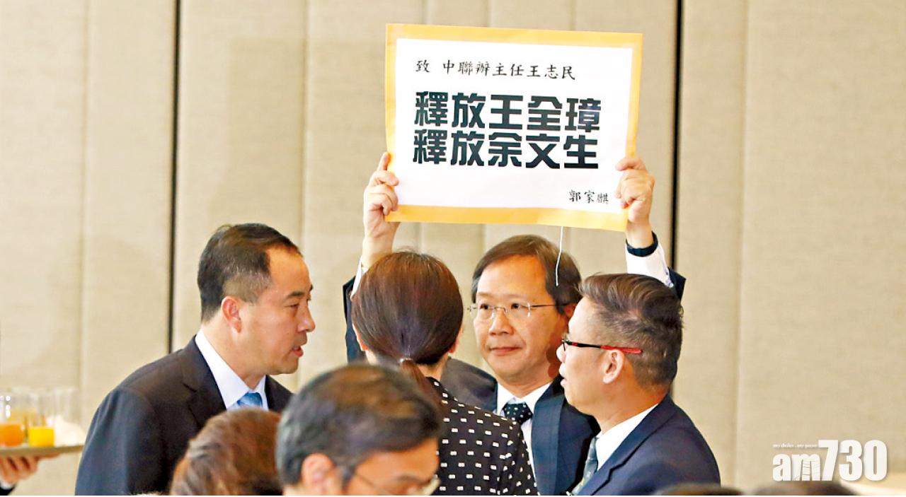 另外,民主黨黃碧雲在王志民致辭後,高呼「重啟政改,落實雙普選」口號,未有受阻。沒有報名出席午宴的公民黨郭家麒,在宴會廳舉起一封寫有「釋放王全璋 釋放余文生」的信件,欲交予王志民,但遭保安阻止並被請走。議會陣線陳志全、毛孟靜與朱凱廸,則在宴會廳外守候,向到場的王志民高叫「結束一黨專政」及「中共政治打壓可恥」等口號。