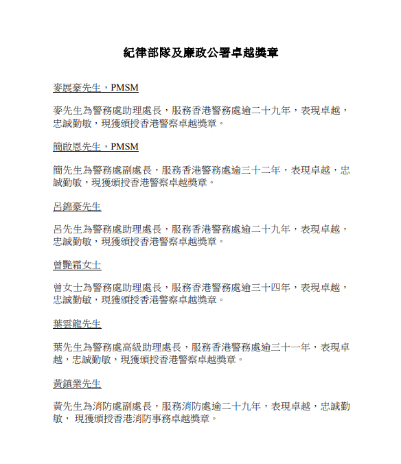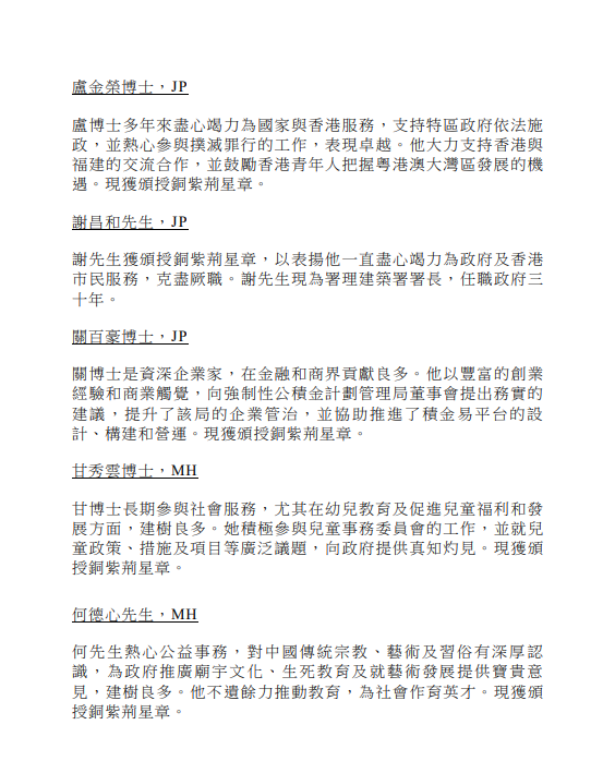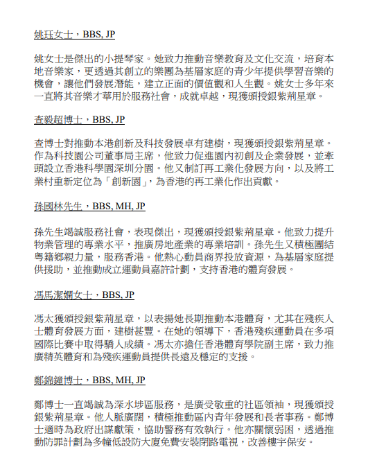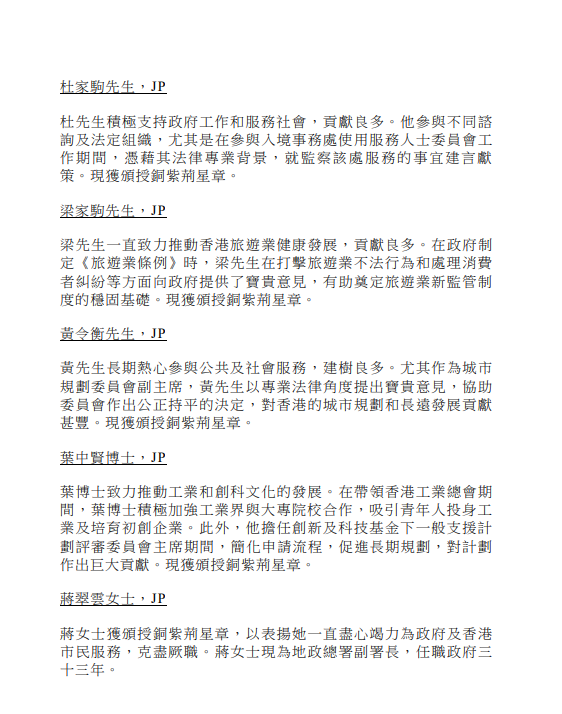 政府今日公布2023年授勳及委任太平紳士名單,獲特首授勳和嘉奬人數共有403人,而獲大紫荊勳章和金、銀、銅紫荊星章共84人,其中5人獲頒最高榮譽大紫荊勳章,包括行會非官守成員兼立法會議員林健鋒、港協暨奧委會會長霍震霆、前理工大學校長潘宗光、工聯會榮譽會長林淑儀,以及施子清博士。另外,曾牽涉洪門夜宴的入境處長區嘉宏、民建聯立法會議員葛珮帆等獲銀紫荊星章,議員何君堯獲銅紫荊星章。至於荷里活廣場斬人案中,持凳阻止疑兇施襲的酒樓廚師輝哥、何兆輝就榮膺銅英勇勳章。