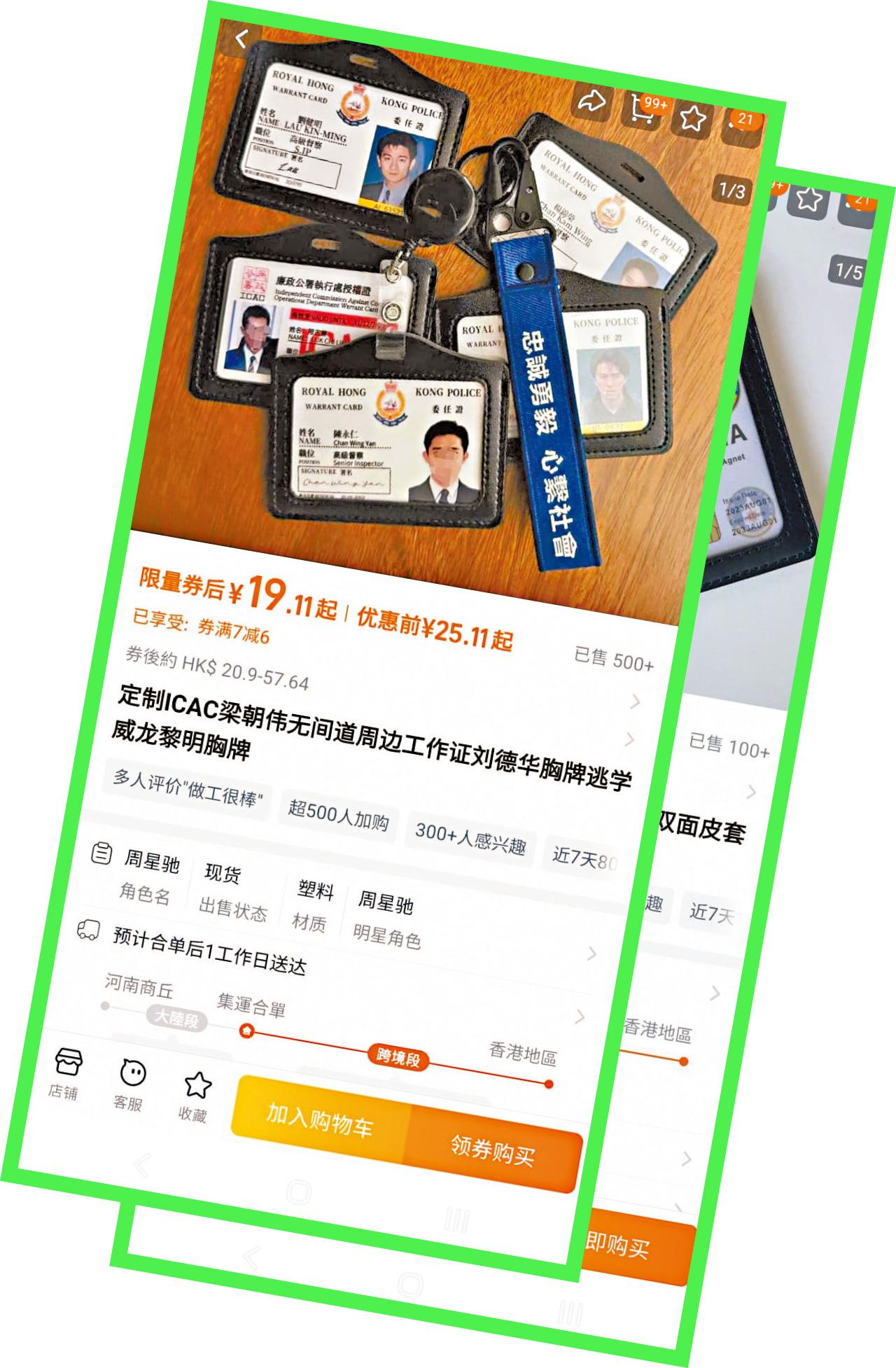 收到自稱執法人員來電要提防,但不同原因擁有「假證件」亦可能誤墮法網。在內地網購平台淘寶,不難發現有商家出售電影角色身份的「警察委任證」,包括《逃學威龍》周星馳飾演的皇家香港警察特別任務連高級督察周星星、《無間道》梁朝偉和劉德華分別飾演的高級督察陳永仁和劉健明委任證,另有其他國家執法部門證件可出售,包括美國中央情報局,甚至列明可自訂名稱與照片等。律師梁永鏗表示,管有、行使虛假文書和冒警均是違法行為,即使證件部分細節略有不同,或做到七成像真,只要他人看似設計相若、能夠以假亂真,便可有合理懷疑推斷有人根本上想冒警。他又說,即使管有者沒有向外展示,當被警方搜身發現同樣有機會墮入法網。