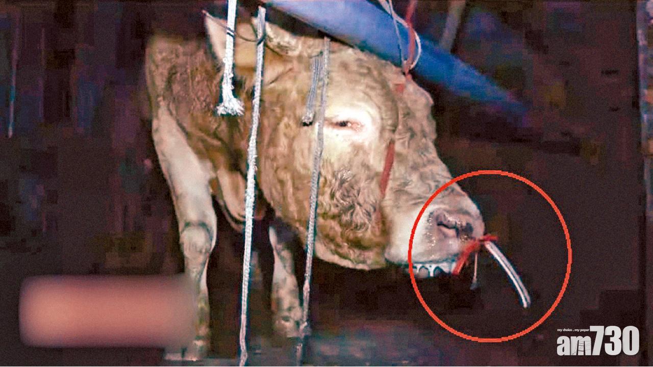 殘忍!有內媒揭發,安徽滁州全椒及來安縣有不法商人在宰殺牛隻前,會強行用膠喉從牛的鼻孔(圖)插入其胃部,然後花12小時分批灌入120斤水「呃秤」,過程中有牛隻痛苦得跪地流淚,並不時慘叫,其中一個涉事屠宰場有工人直認此舉殘忍,但老闆卻稱,「牛反正都是要宰殺的,有沒有注水,等待牠們的結果都是一樣的」。目前兩個涉事屠宰場及6個灌水牛肉攤已被警方搗破,29人被捕。