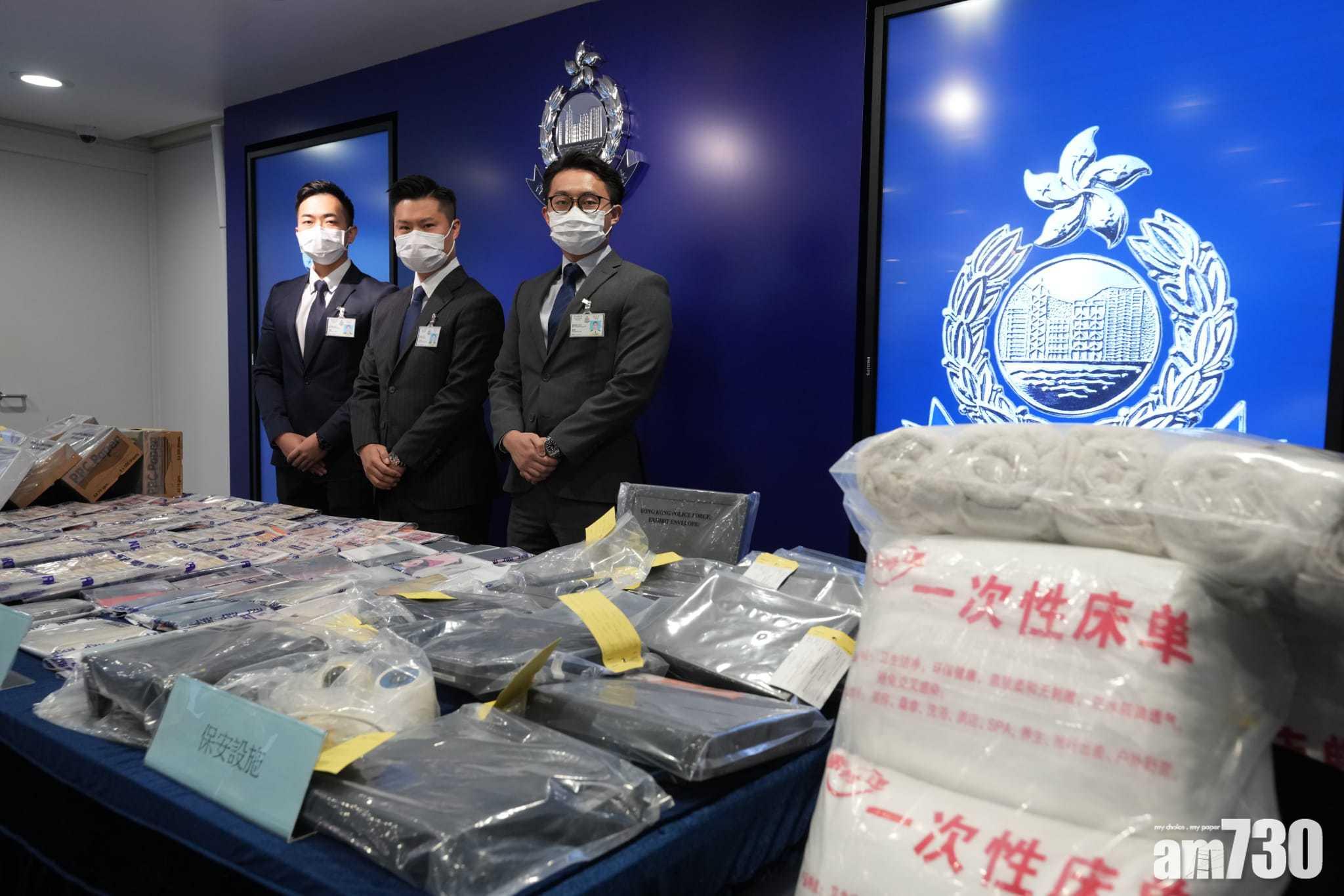 警方展示拘捕行動相片,以及檢獲的物品和現金等。(陳奕釗攝)