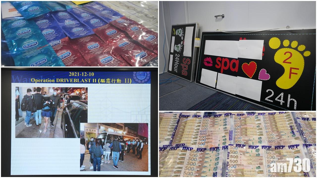 警方打擊非法賣淫活動,在今年7月至12月期間,成功搗破25間位於灣仔和銅鑼灣、喬裝為按摩院的樓上賣淫場所,合共拘捕101人,年齡介乎19歲至60歲,當中包括96女及5男,被捕女子中有泰國籍、越南籍和印尼籍,亦有來自內地的非法入境者。警方指他們涉嫌經營賣淫場所、違反逗留條件、依靠他人賣淫的收入為生等,並行動中檢獲大量證件及逾84萬元現金等。