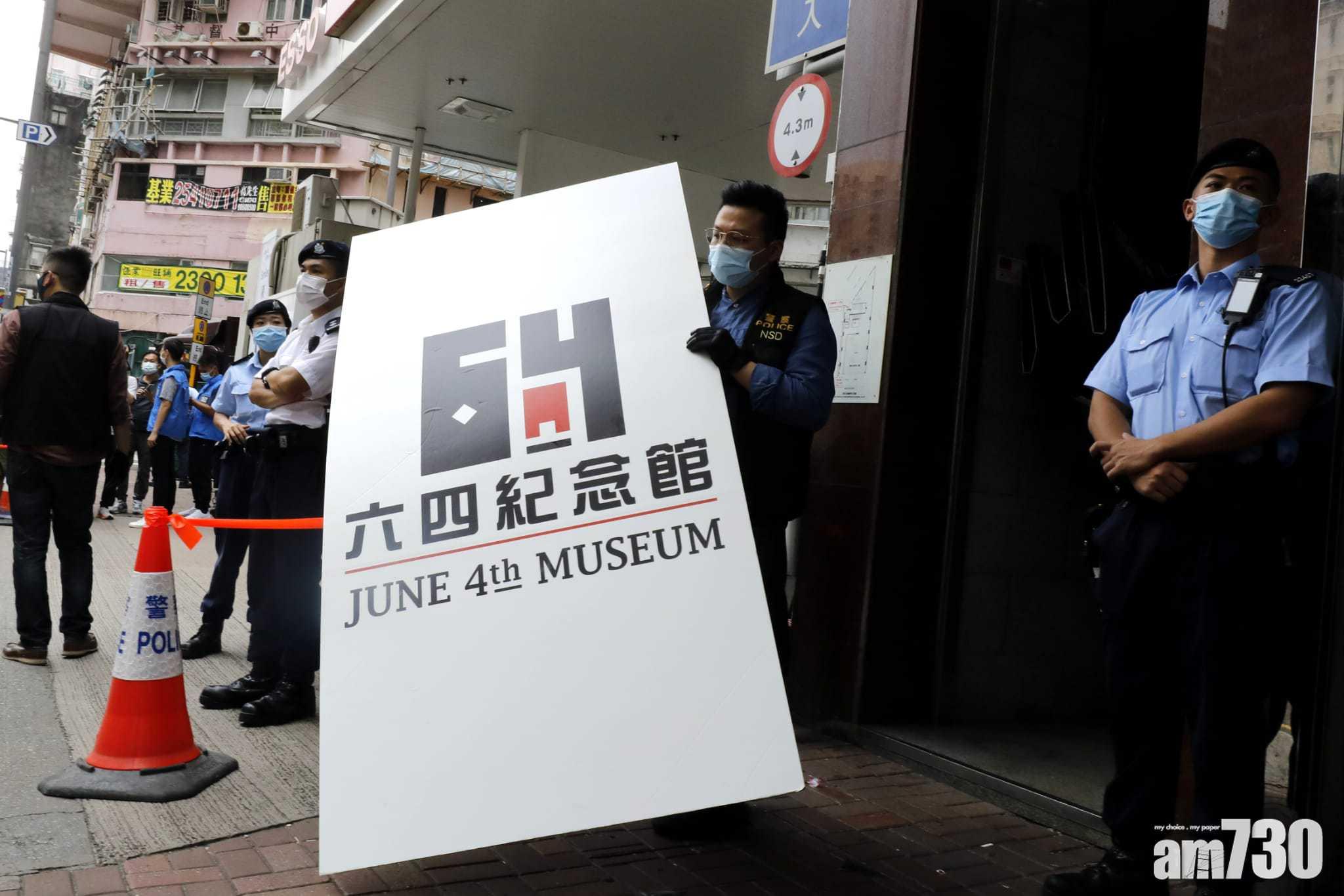 警方國安處今早派員到六四紀念館蒐證,期間大批警員在大廈外看守及戒備,並封鎖涉事藝旺商業大廈的出入口。至下午,鎖上手扣的梁錦威被押抵現場協助調查,警員亦帶走大批證物,包括闡述八九民運的展板和圖畫、民主女神像展板、20多箱物品包括書籍等。目前現場已解封。
