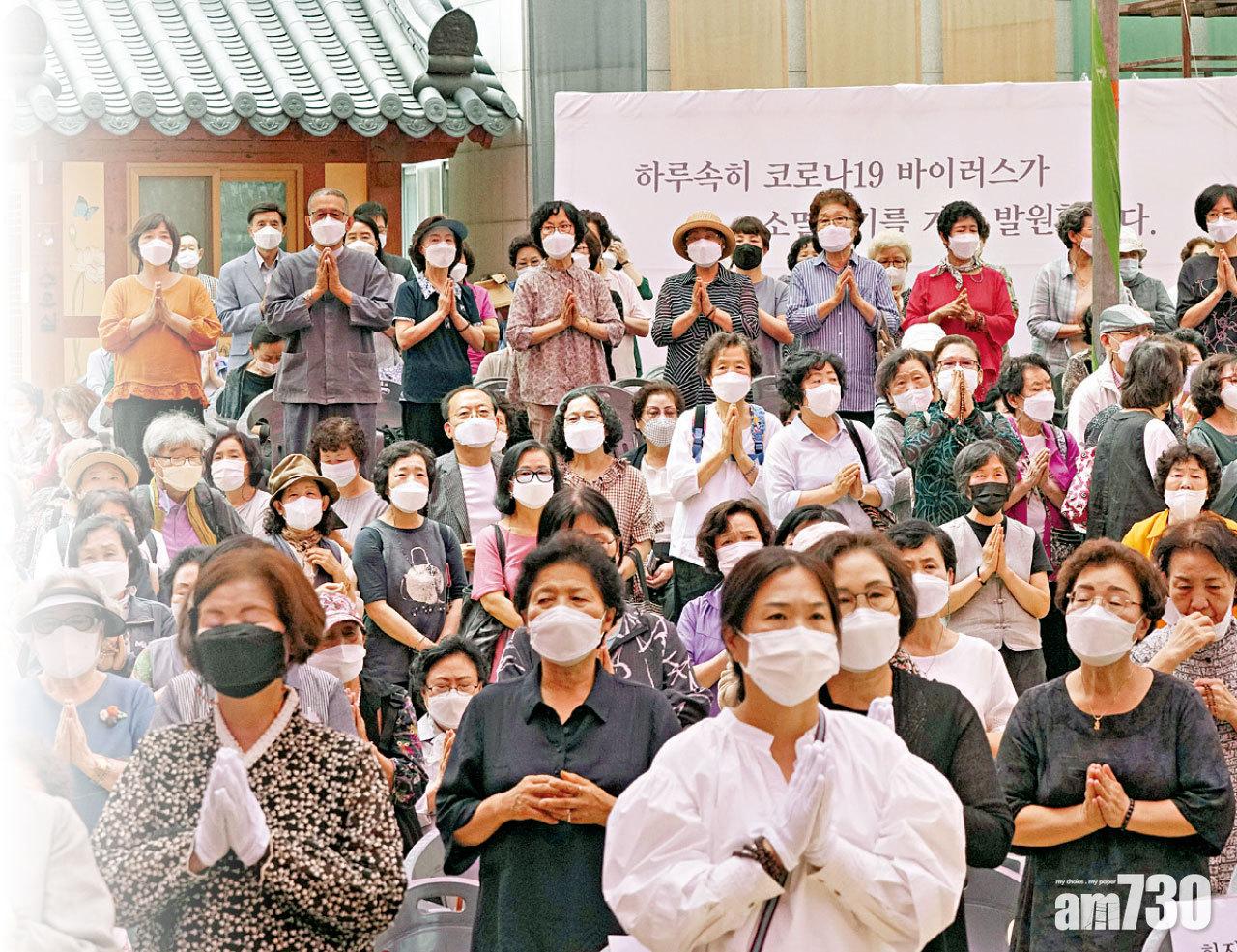 首爾有寺院周一舉辦活動,信眾均戴上口罩。(美聯社)