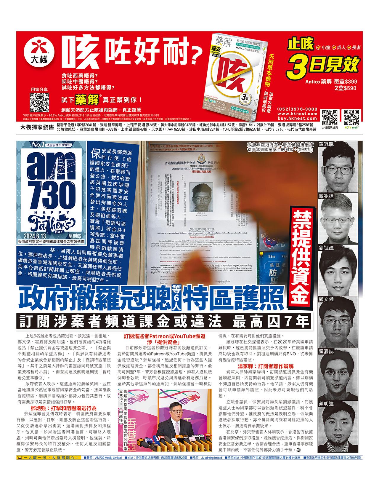 保安局長鄧炳強昨行使《維護國家安全條例》的權力,在憲報刊登公告,對6名潛逃英國並因涉嫌干犯危害國家安全罪行而被法院發出拘捕令的人士,包括羅冠聰及劉祖廸等人,實施「撤銷特區護照」等合共4項措施;當中霍嘉誌同時被暫時吊銷執業資格,另兩人則同時暫罷免董事職位。鄧炳強表示,上述潛逃者在英國得到包庇,繼續危害香港和國家安全;又強調任何人透過任何平台包括訂閱其網上頻道,向潛逃者提供資金,均屬違反有關措施,最高可判監7年。