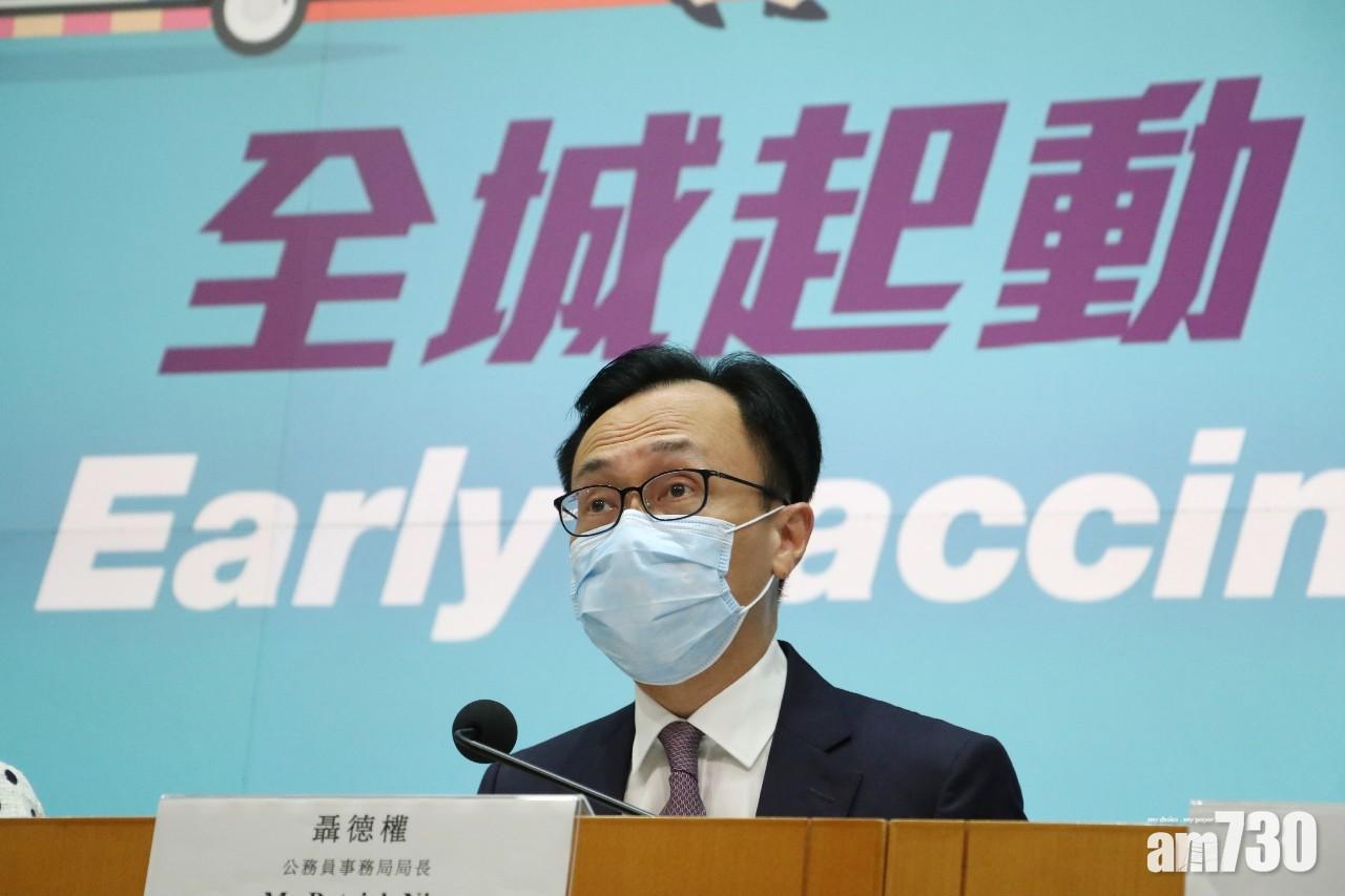 公務員事務局長聶德權表示,疫苗接種計劃已展開105日,政府將復必泰疫苗接種年齡降低至12歲,明日開始接受12至15歲人士疫苗接種預約。經調整後,全港適合接種疫苗人口會增至682萬。