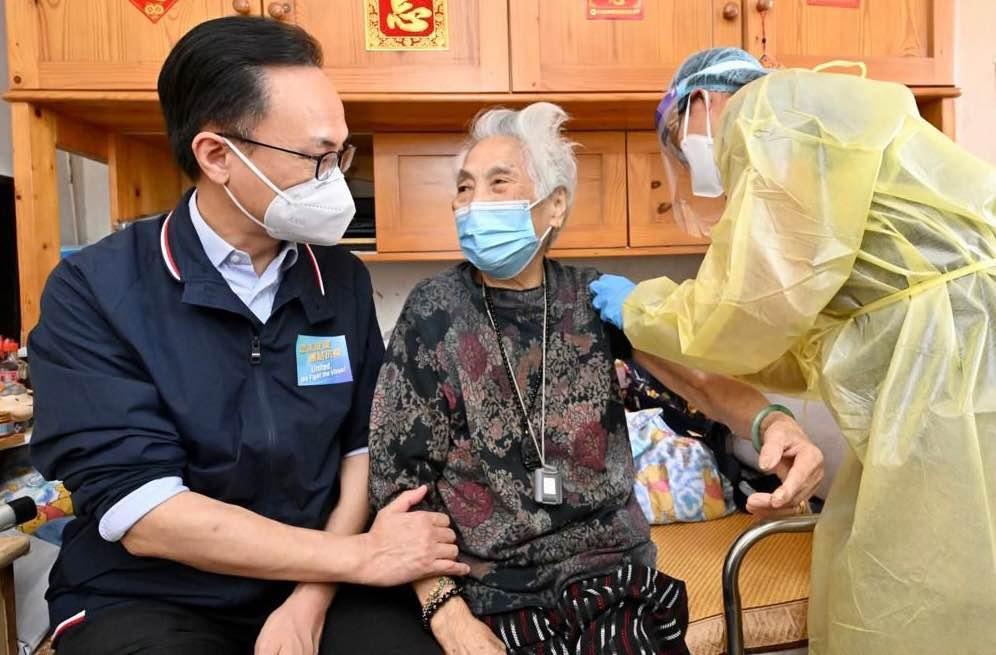 政府目標推高兒童及長者接種率至九成,早前預告將推行上門打針計劃。香港社會服務聯會與香港醫學組織聯會早前推出「疫苗易」家居接種計劃,為有需要人士上門打針,料逾1萬人受惠。公務員事務局長聶德權今日到長沙灣幸福邨福明樓視察社聯的接種活動,為當局稍後推行的上門打針服務作準備,年過九旬的鄭婆婆在聶德權陪同下,在家中由醫護人員注射科興疫苗。