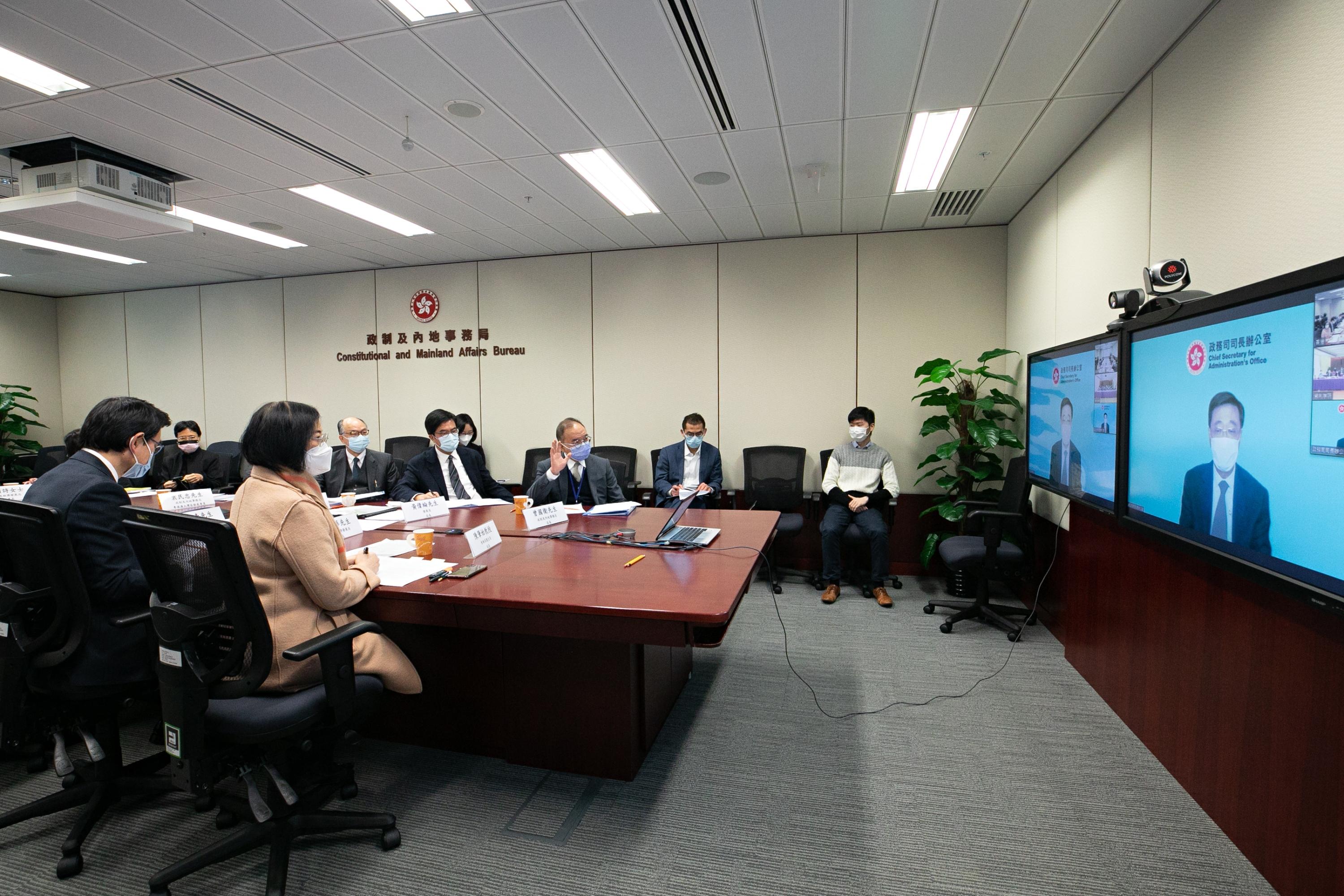李家超與港澳辦副主任黃柳權、內地的專班負責人和香港5個工作小組負責局長舉行視像會議。 (政府圖片)