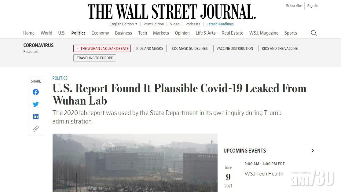 《華爾街日報》(WSJ)及美國有線新聞網絡(CNN)引述消息報道,美國政府的國家實驗室一份機密報告得出結論,指稱新冠病毒從武漢實驗室洩漏的假設「貌似有理」,值得進一步調查。