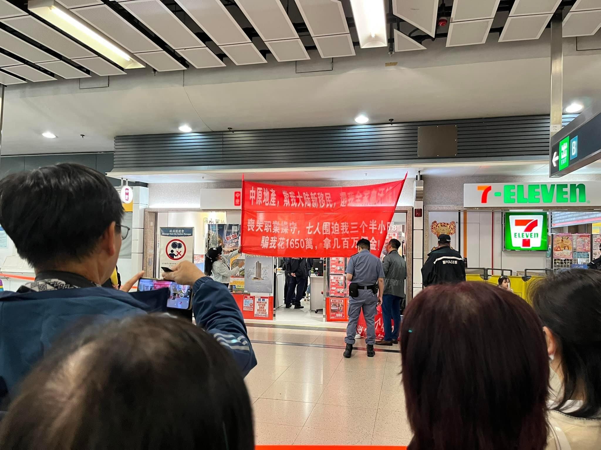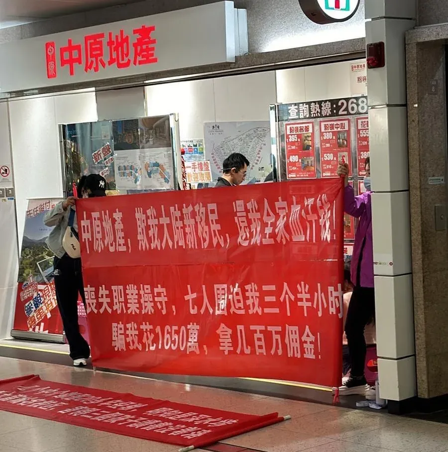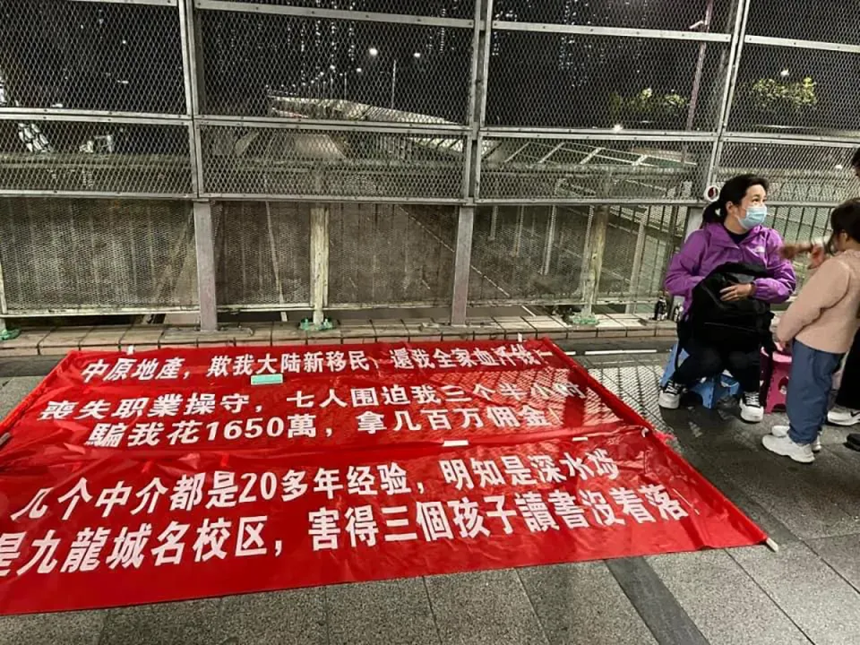有網上流傳照片顯示,有數名「大陸新移民」的人士,在粉嶺站外中原地產分店前聚集,並展示橫額,橫額上寫有「欺我大陸新移民,還我全家血汗錢」、「騙我花1650萬」等字句。